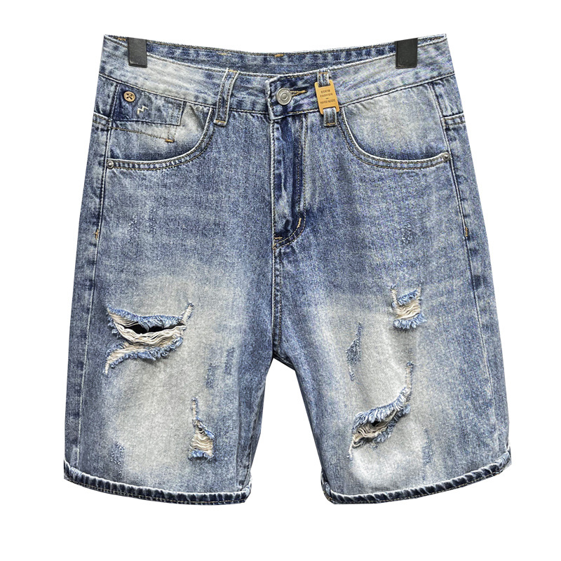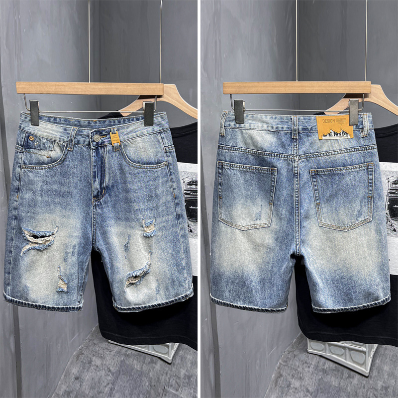 欧洲站高端复古个性乞丐破洞新塘牛仔短裤男士五分中裤子宽松直筒