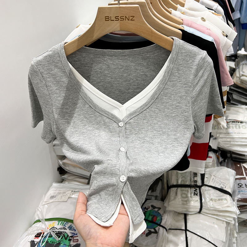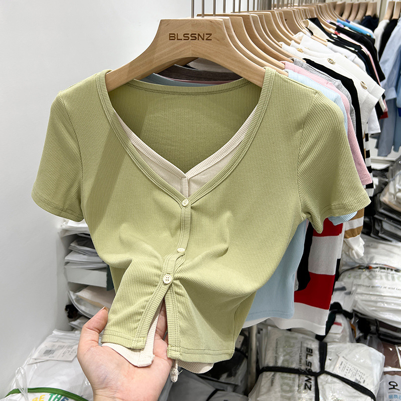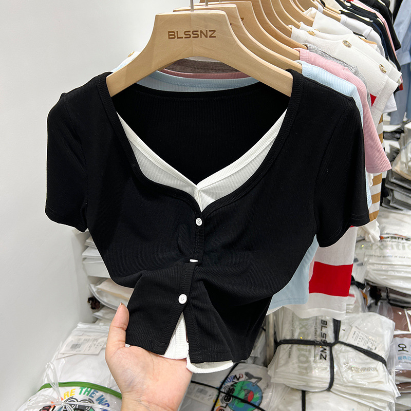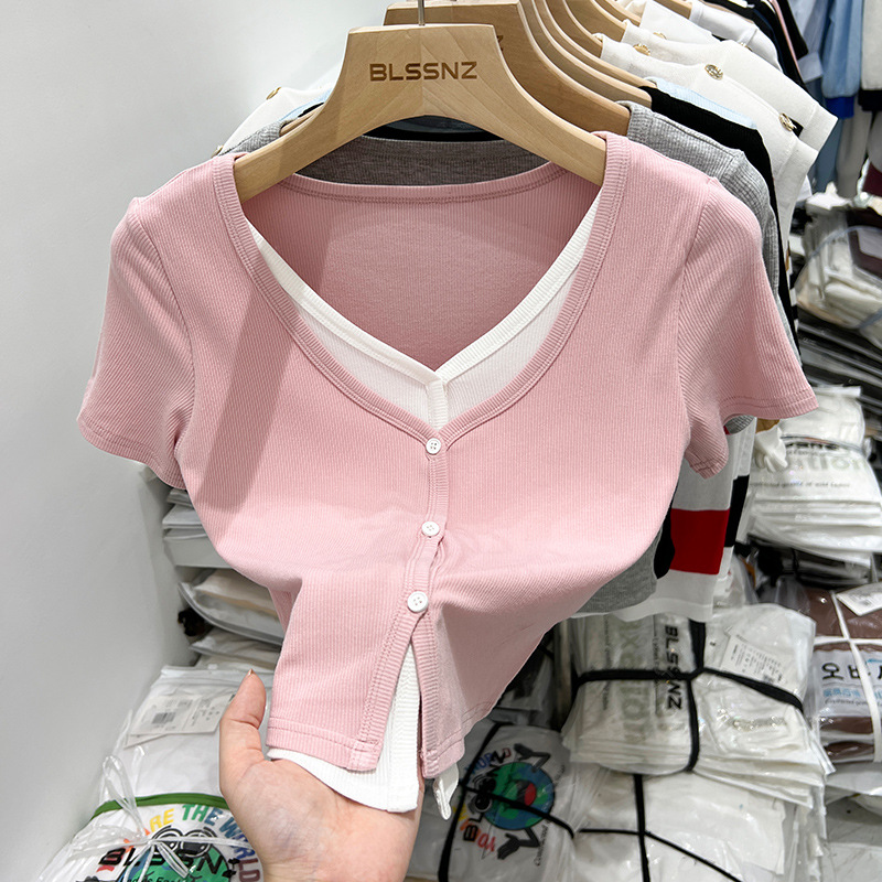 v领短袖t恤女修身设计感小众夏季别致假两件甜辣短款上衣半袖体恤