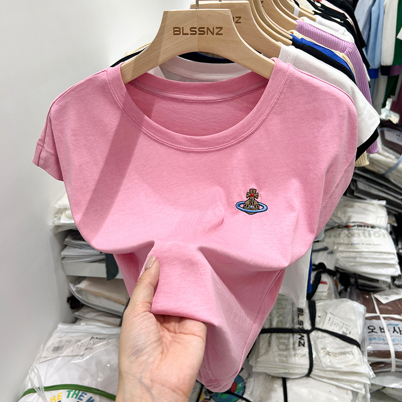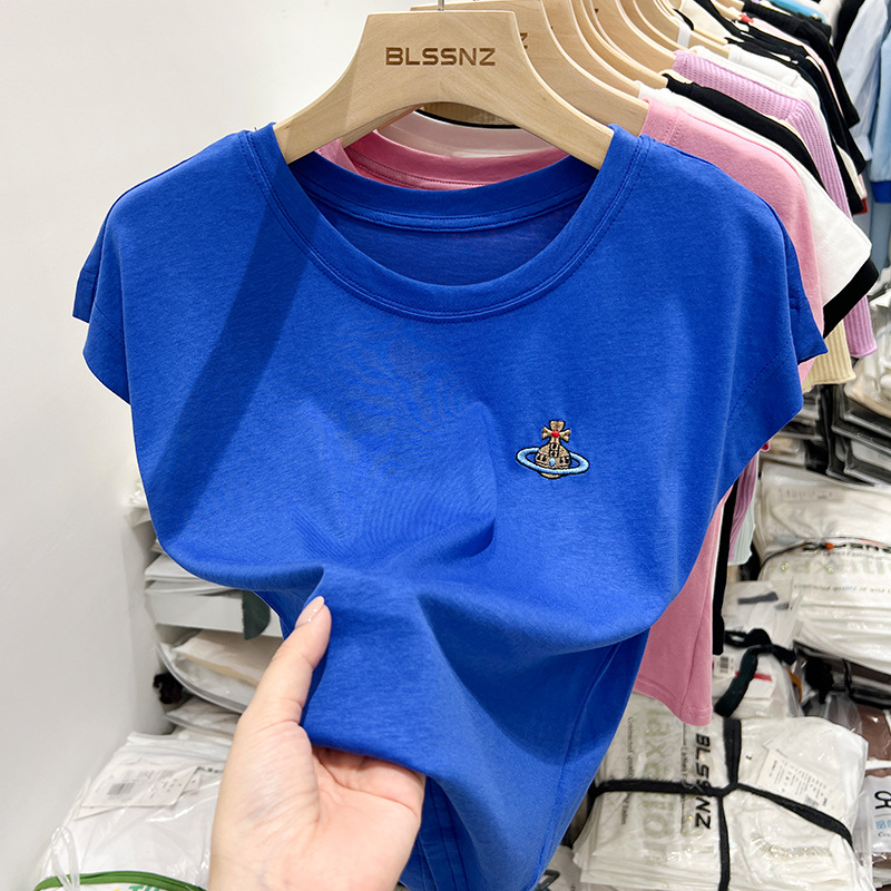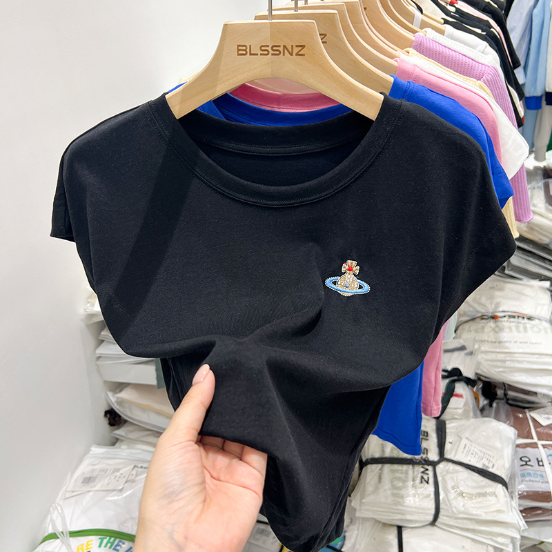 短款t恤女夏季新款洋气小衫刺绣修身辣妹无袖上衣