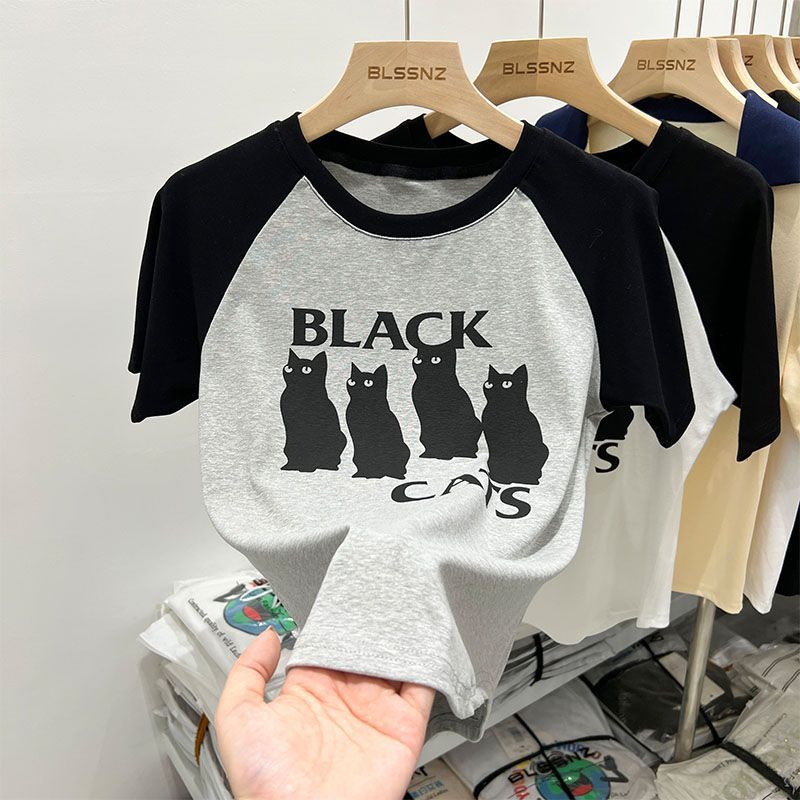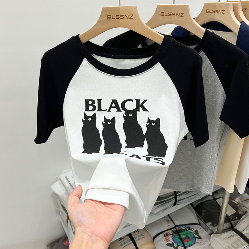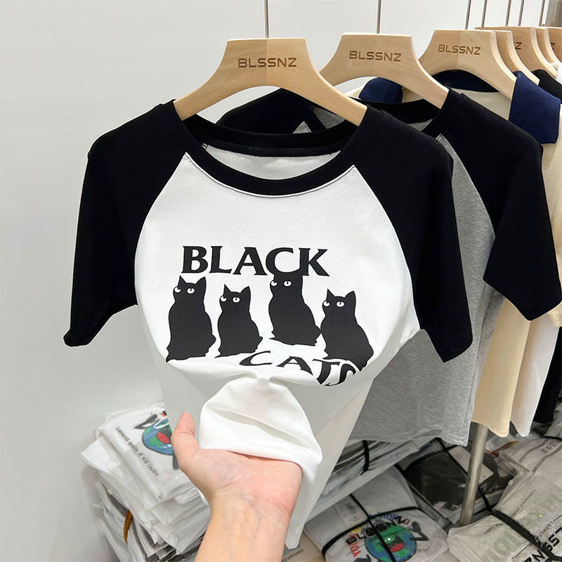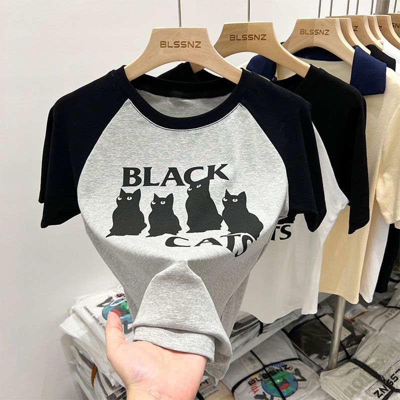 欧货美式复古正肩短袖t恤女夏新款撞色印花独特别致短款上衣
