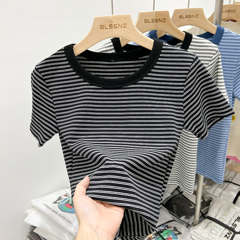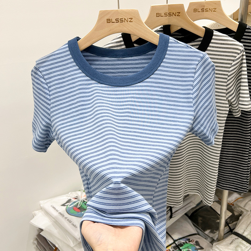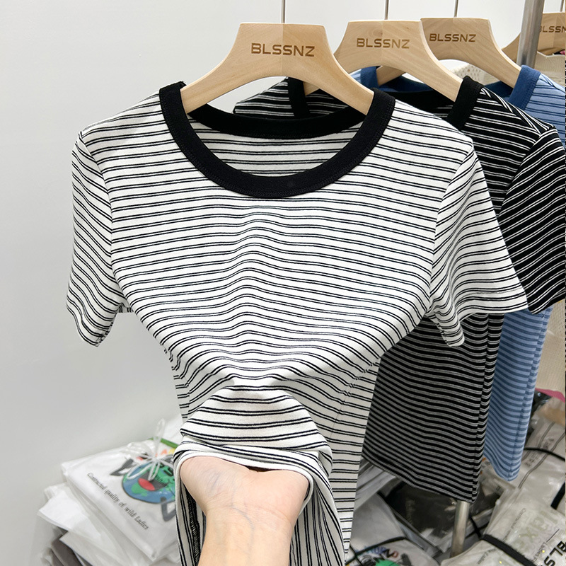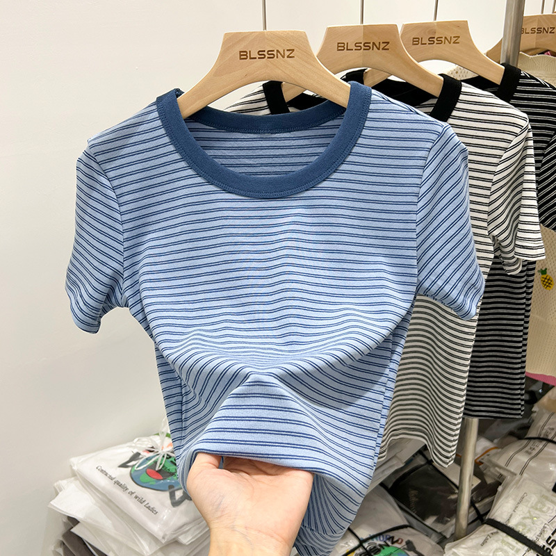 欧货条纹撞色短袖t恤女夏季年新款修身时尚洋气百搭半袖上衣