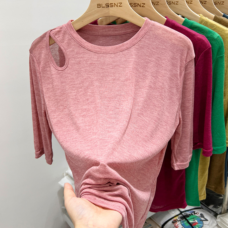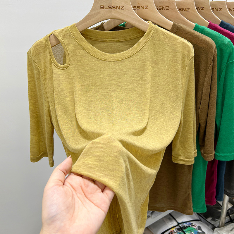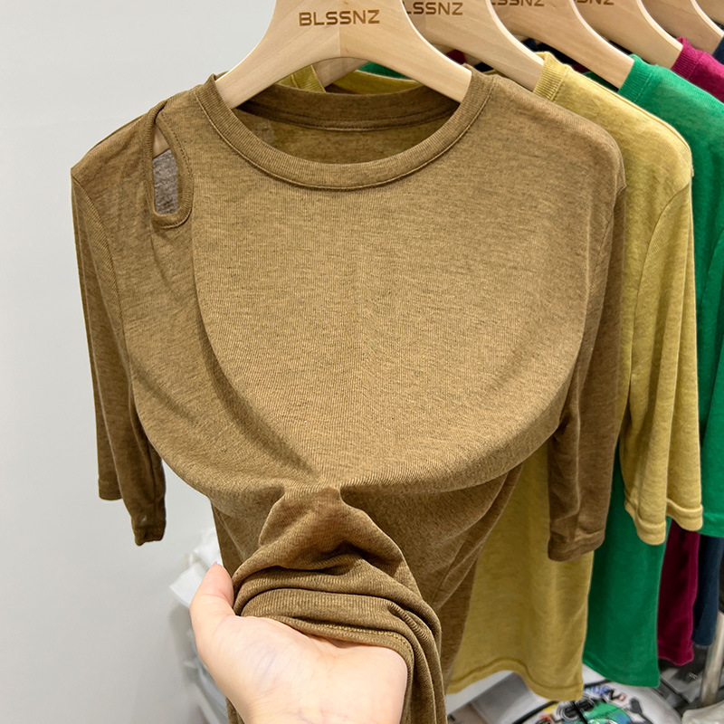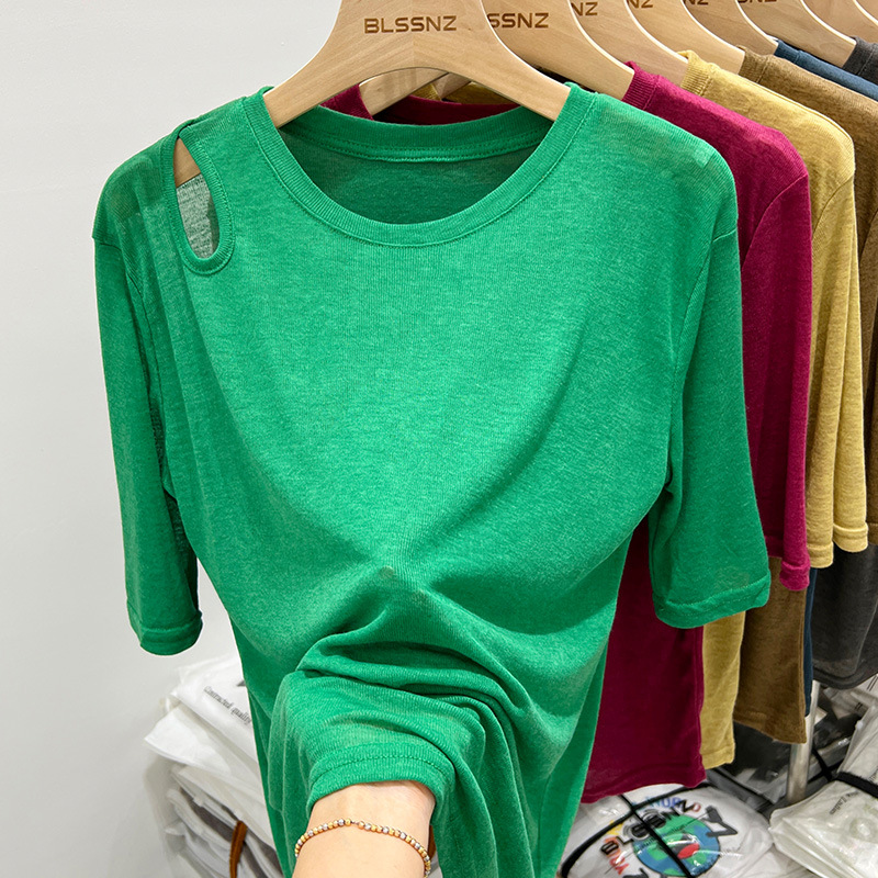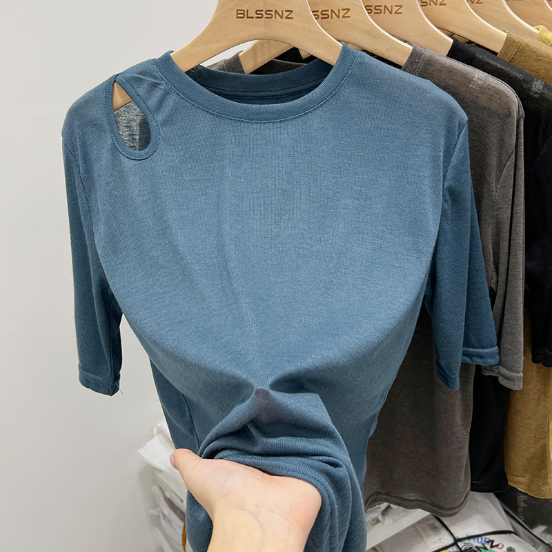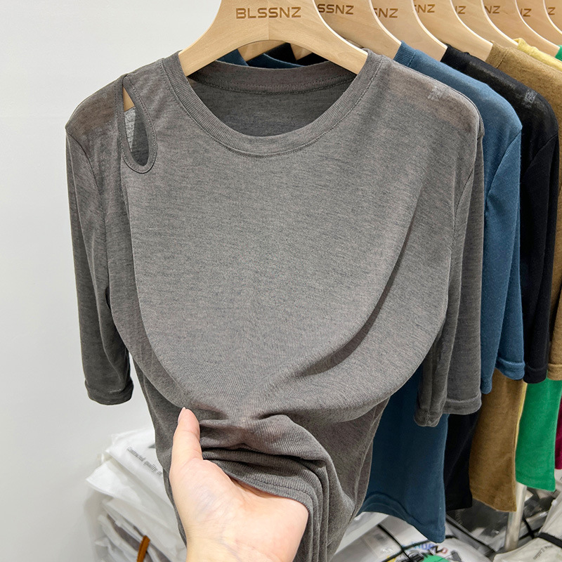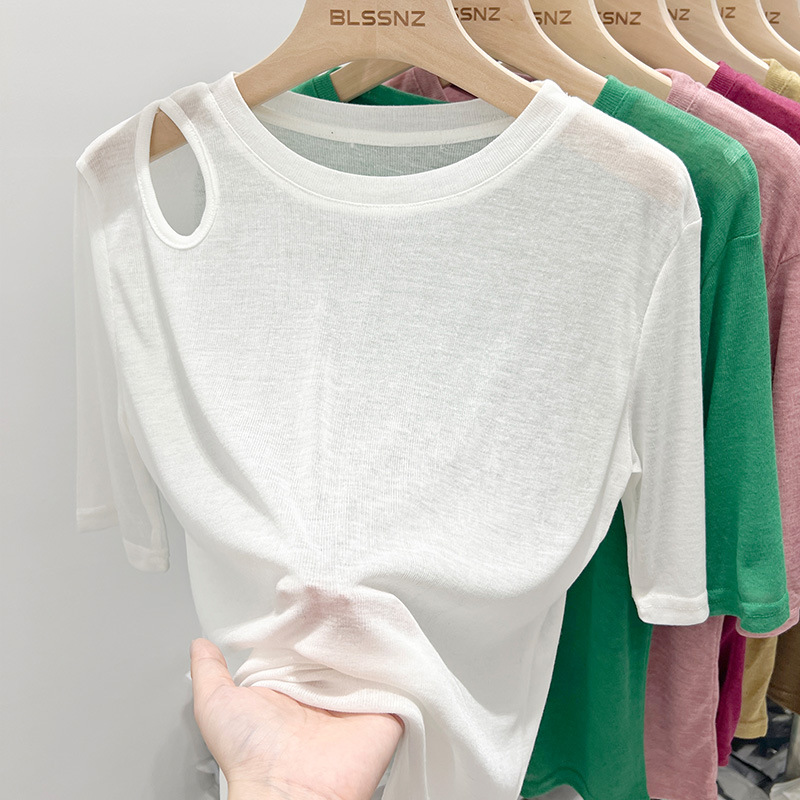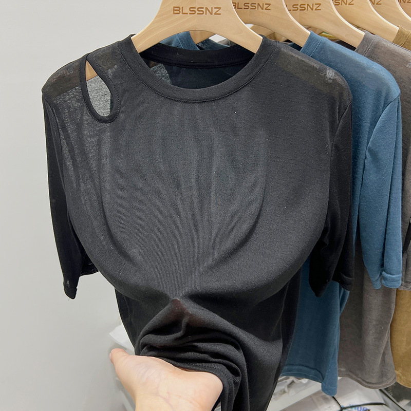 欧货冰丝面膜短袖t恤女ins潮宽松夏季镂空露肩薄款上衣设计感小众