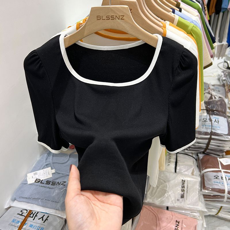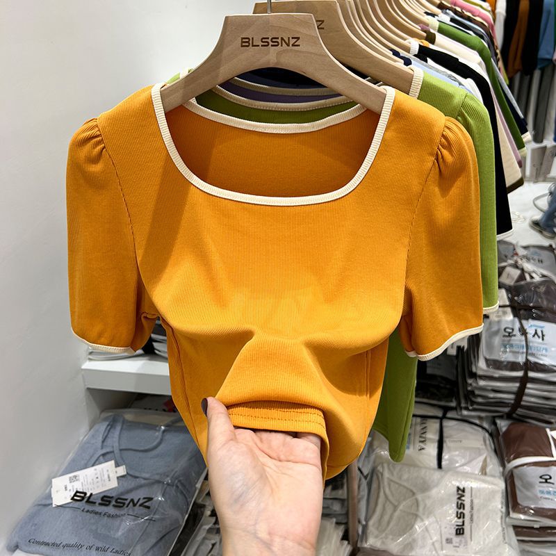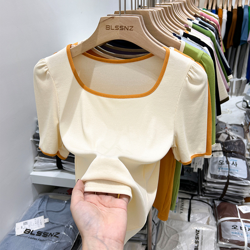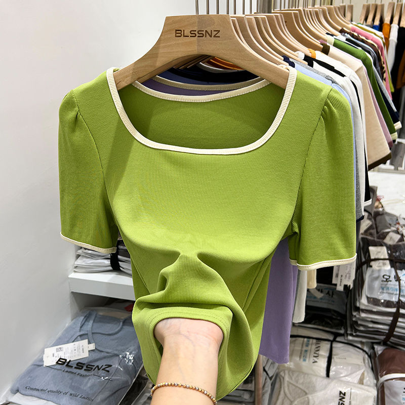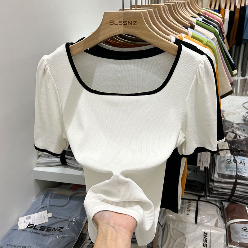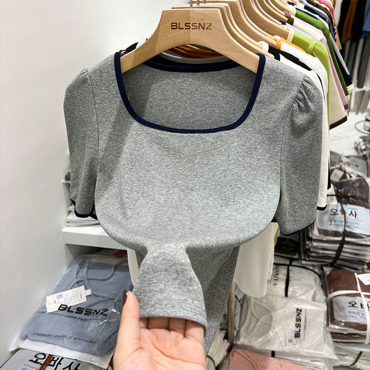 螺纹短袖t恤女夏修身纯欲独特别致锁骨方领短款上衣女设计感小众