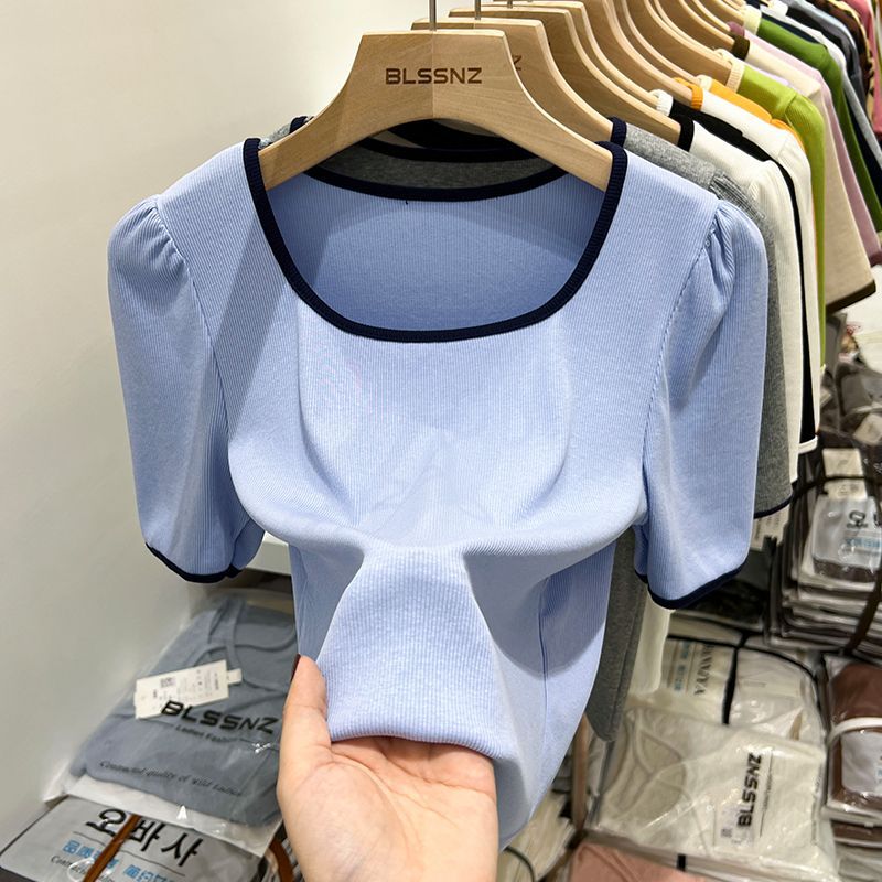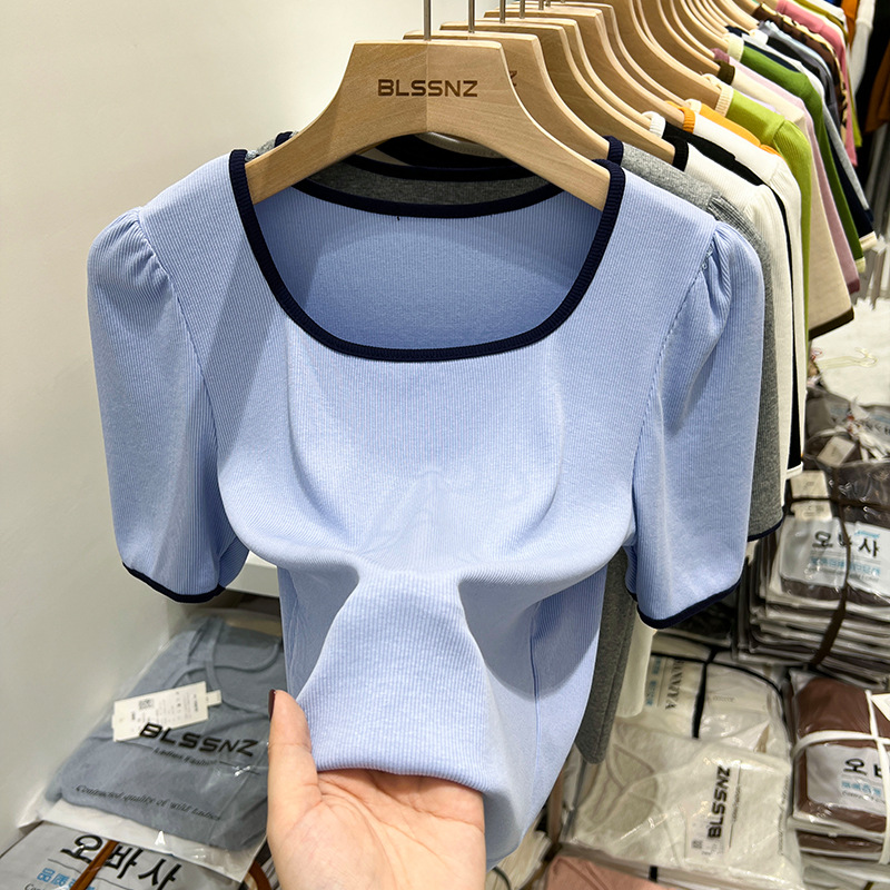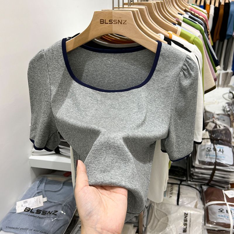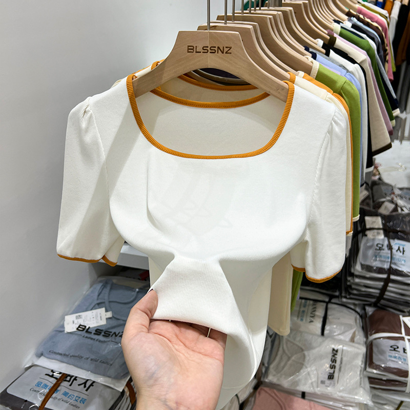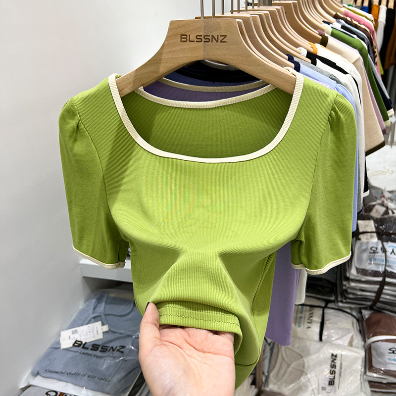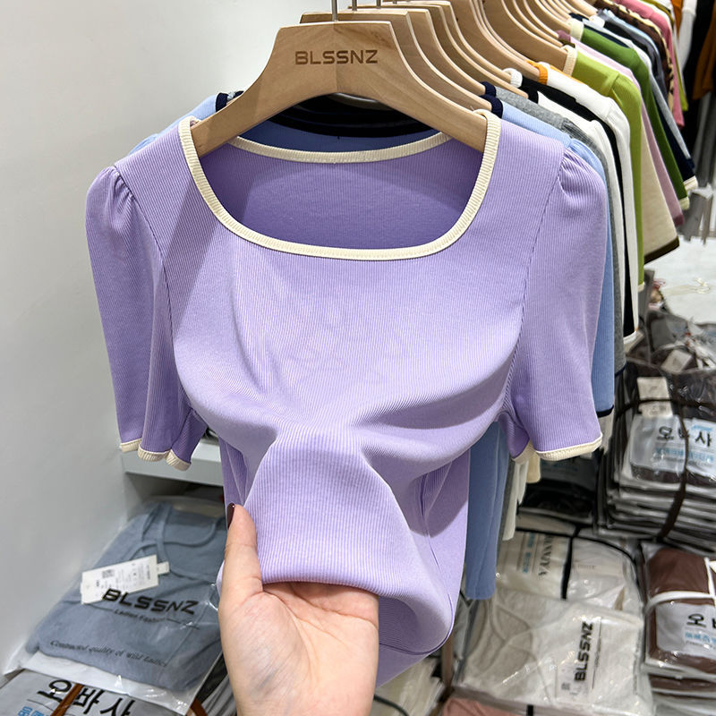 螺纹短袖t恤女夏修身纯欲独特别致锁骨方领短款上衣女设计感小众