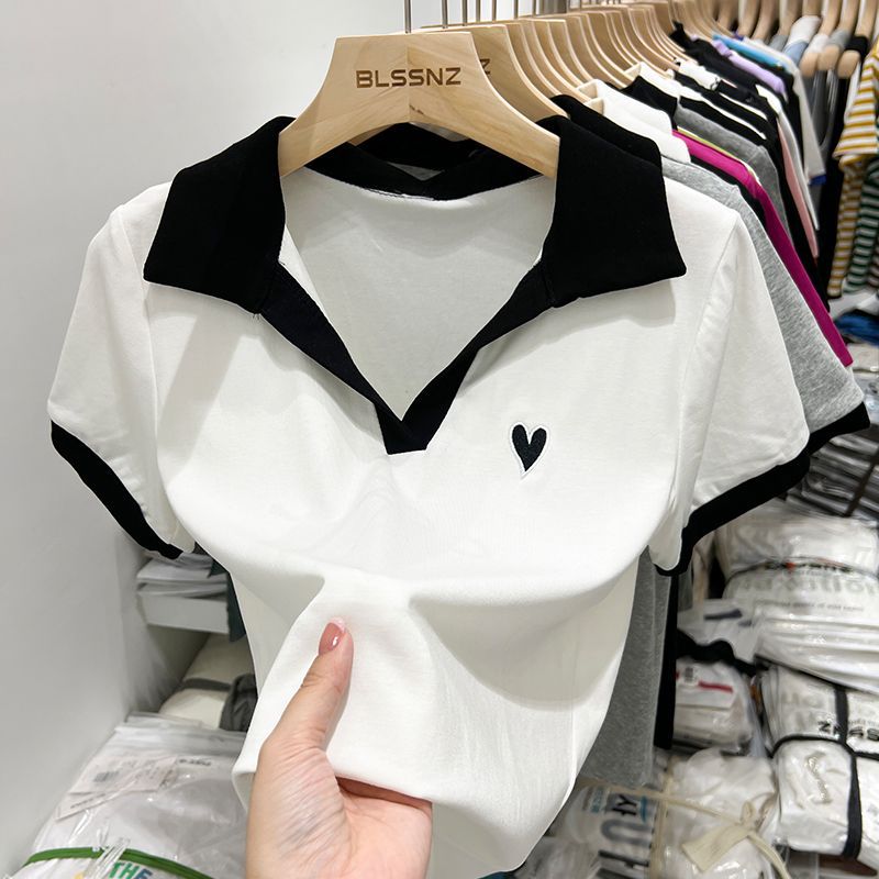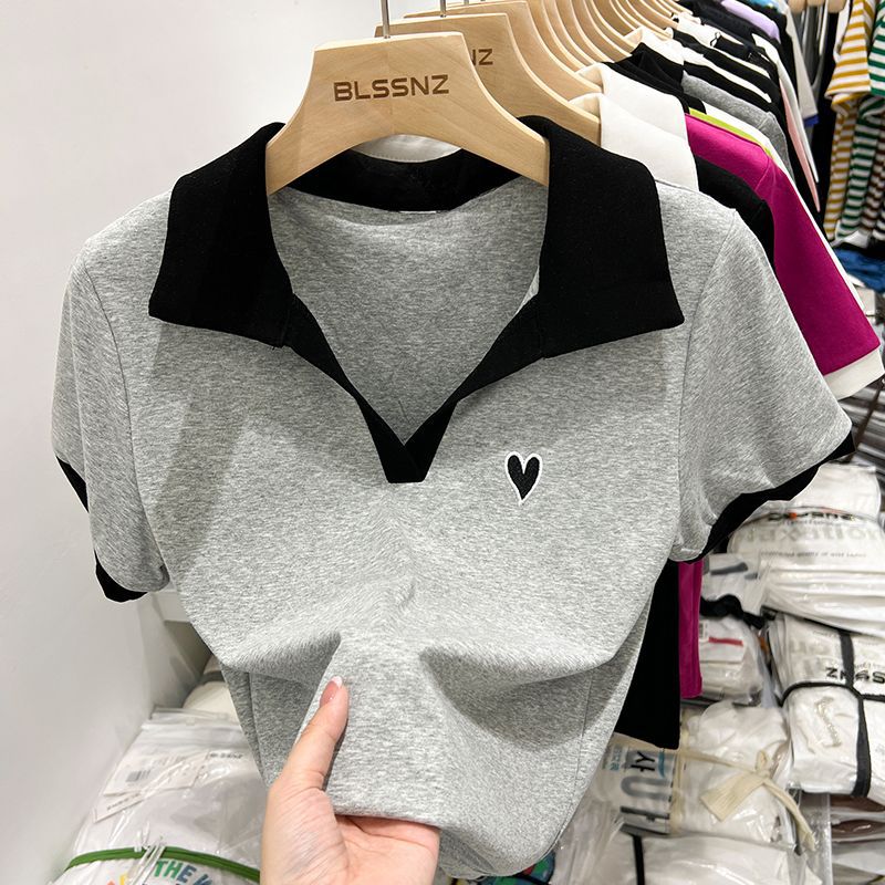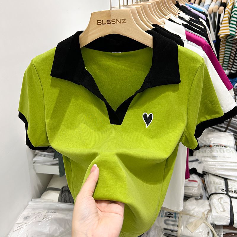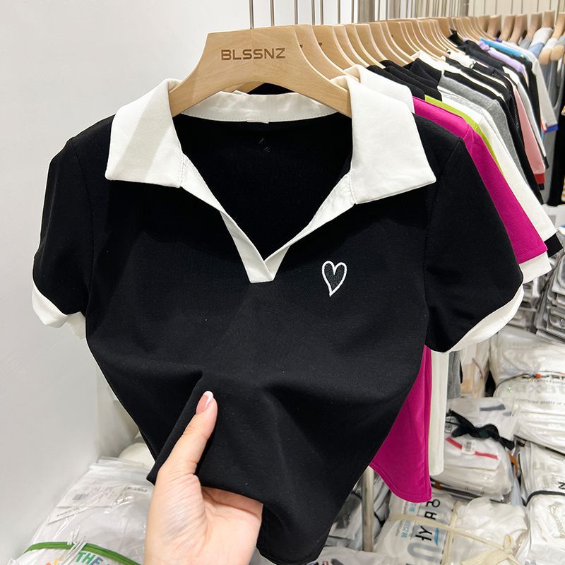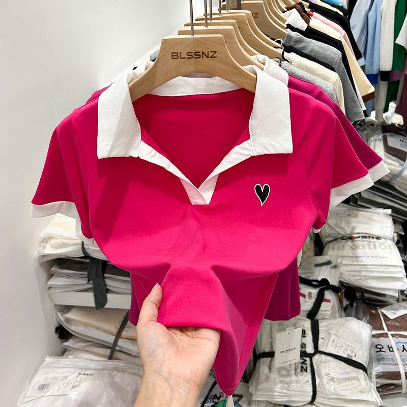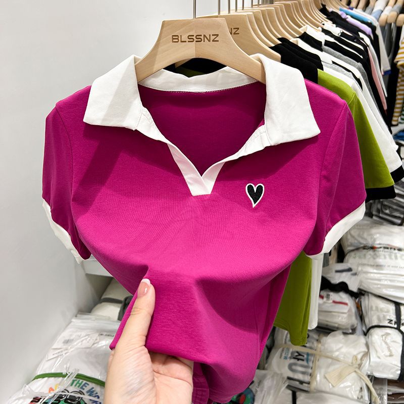 火龙果色polo领t恤女短袖夏季独特别致撞色v领短款上衣女设计感潮
