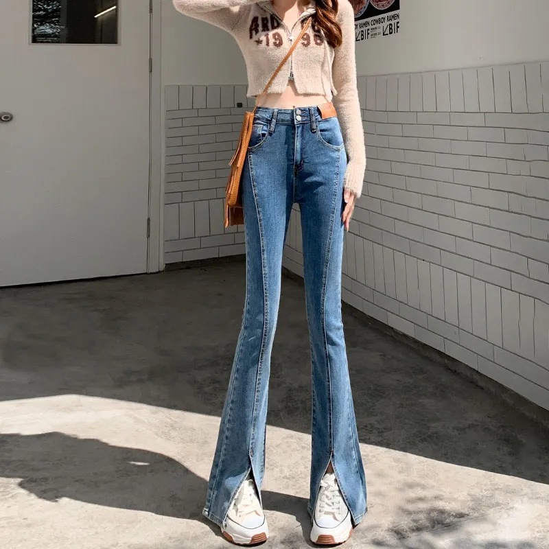 设计感开叉微喇牛仔裤女修身百搭2025新款高腰显瘦喇叭裤高街