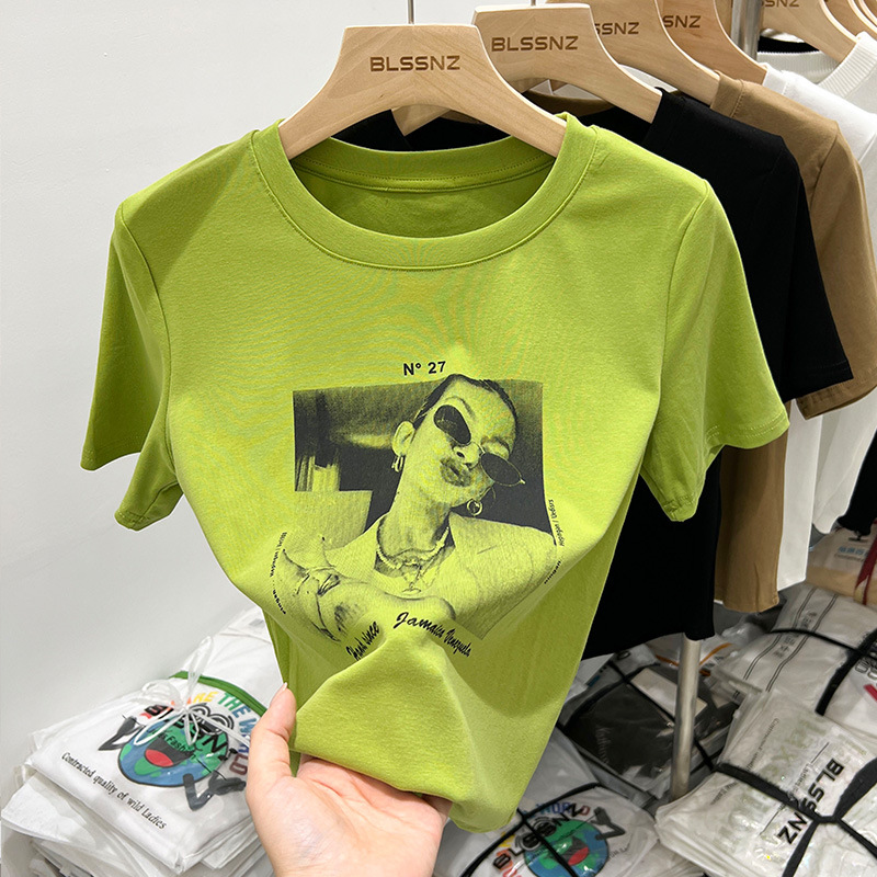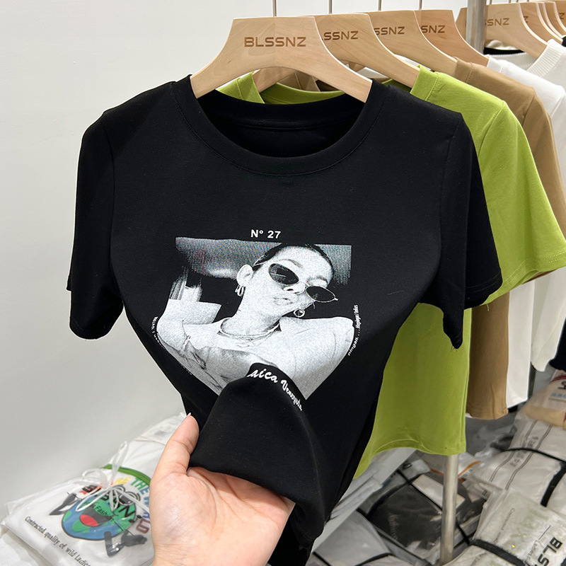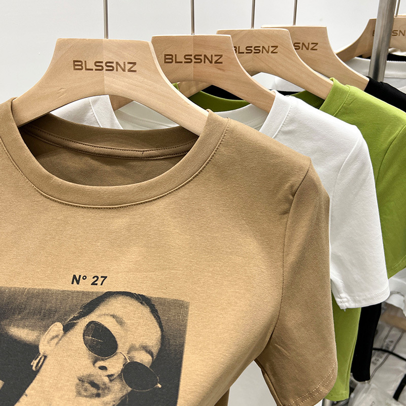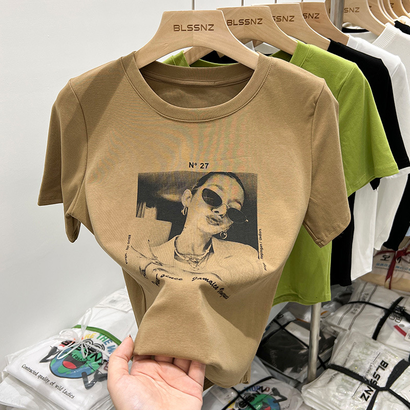 美式复古印花正肩短袖t恤女ins夏季棉半袖体恤修身显瘦短款上衣