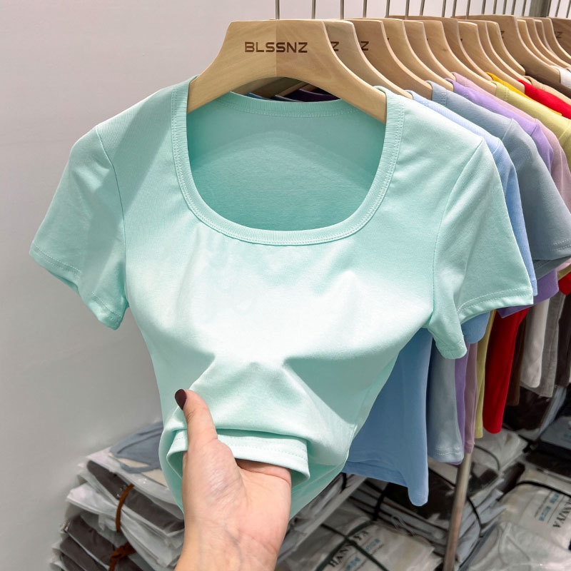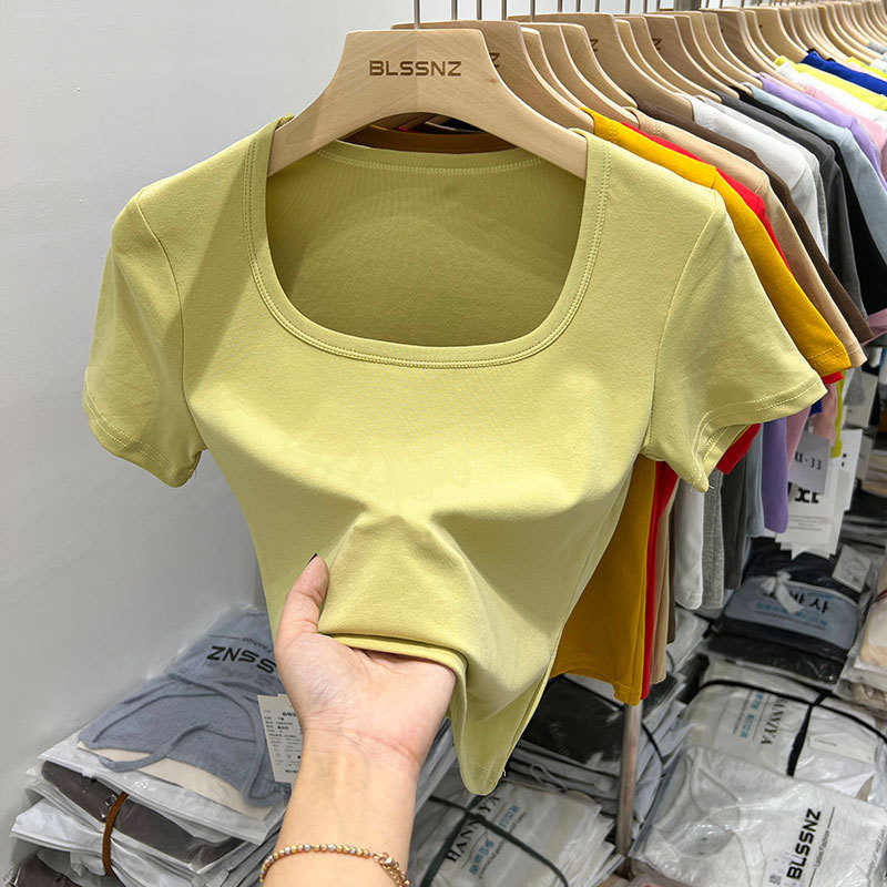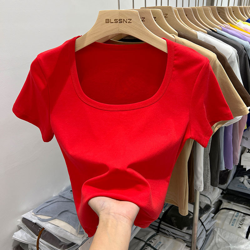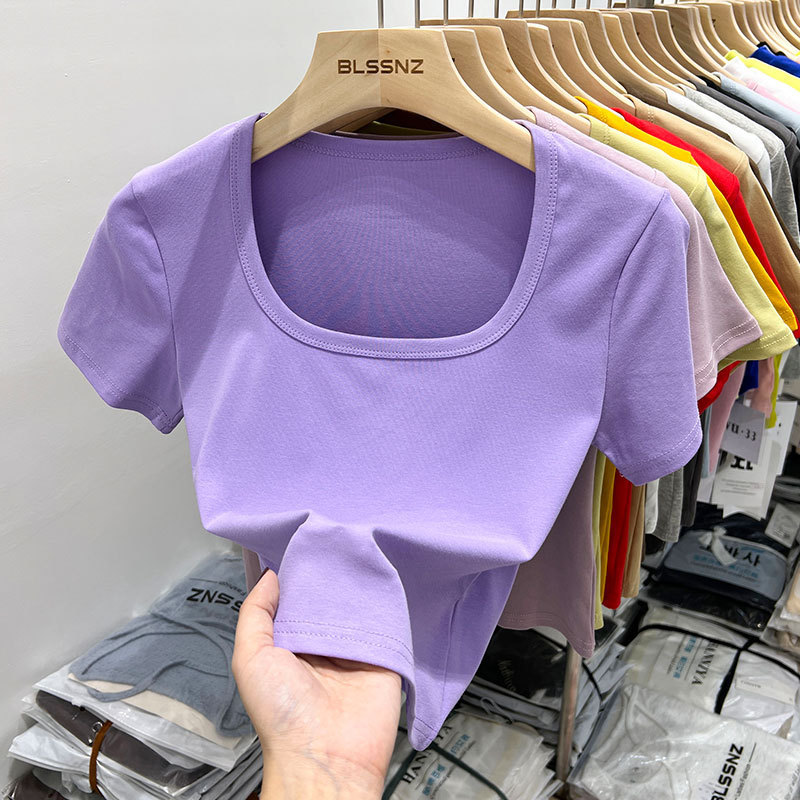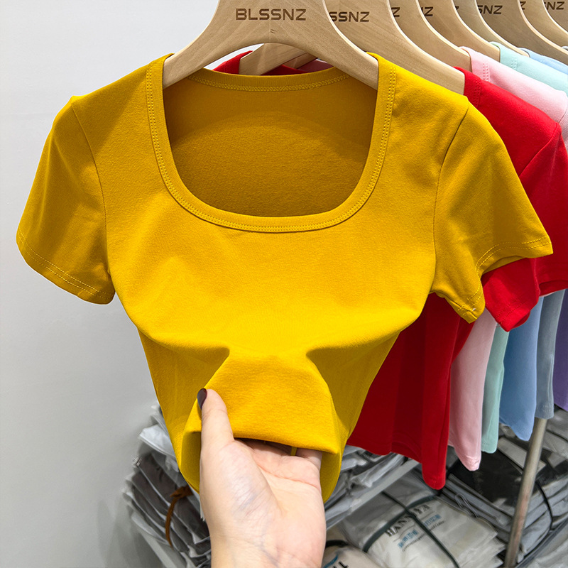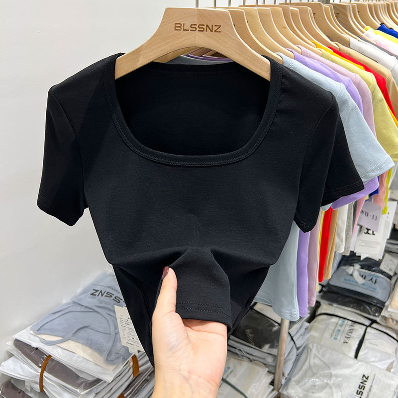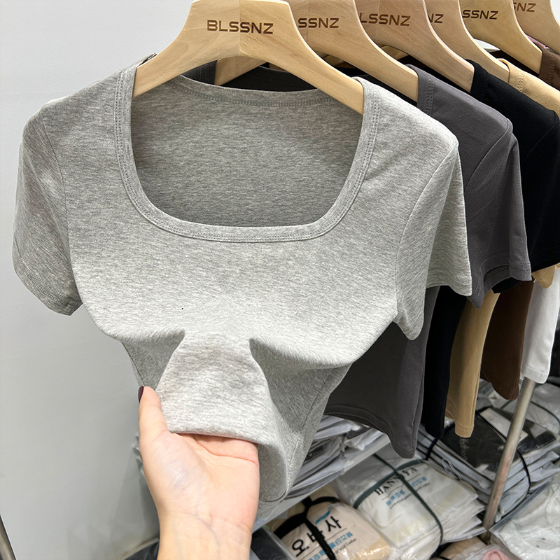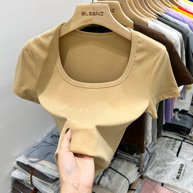 短袖t恤女夏装新款纯欲露锁骨方领热辣短款上衣女体恤潮