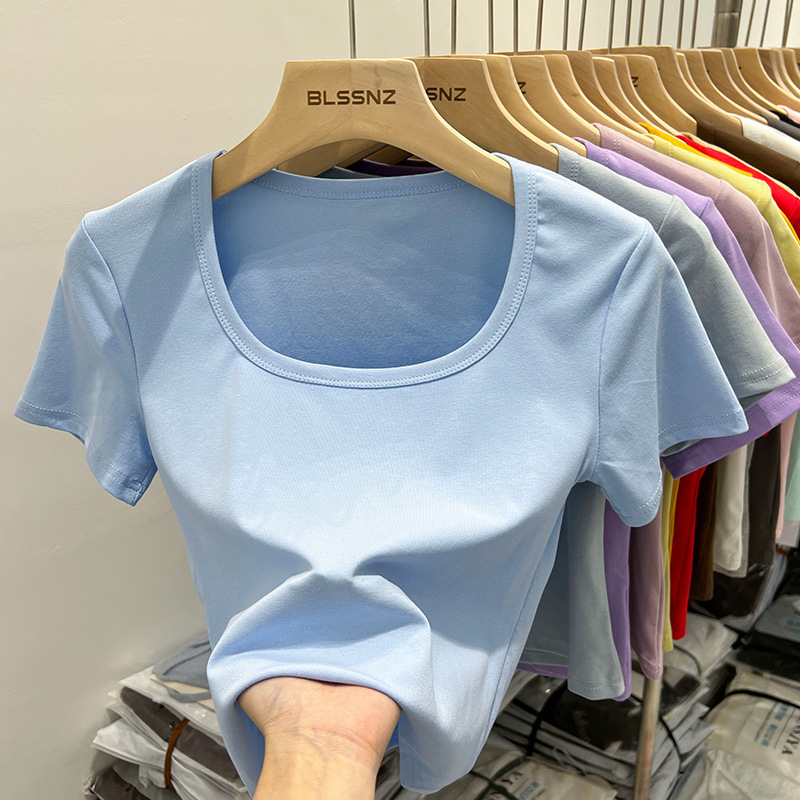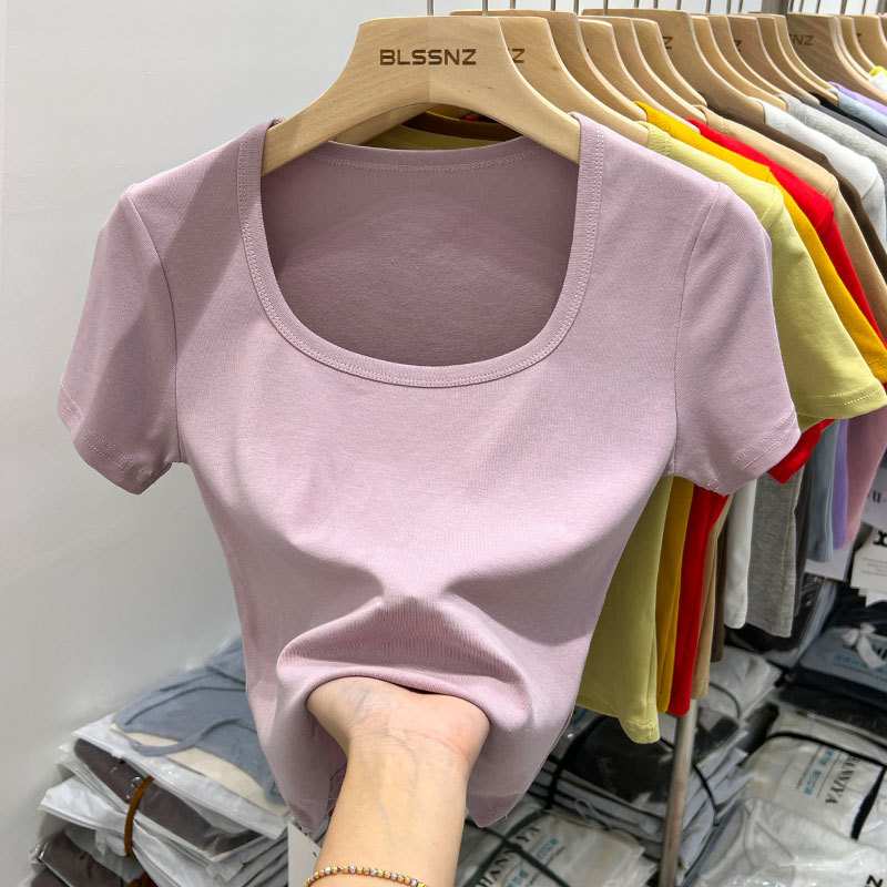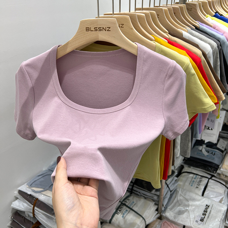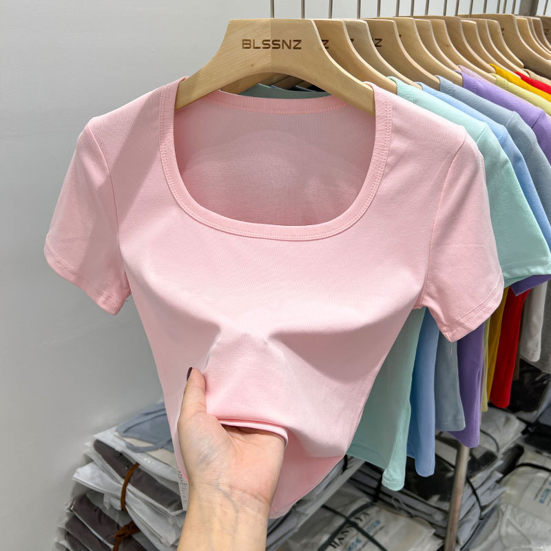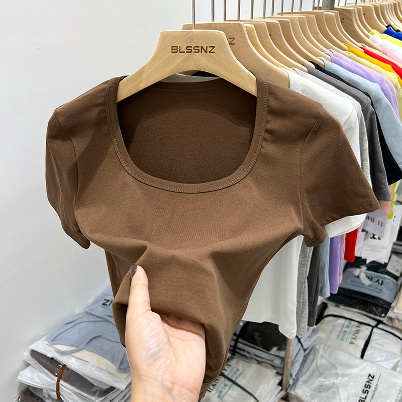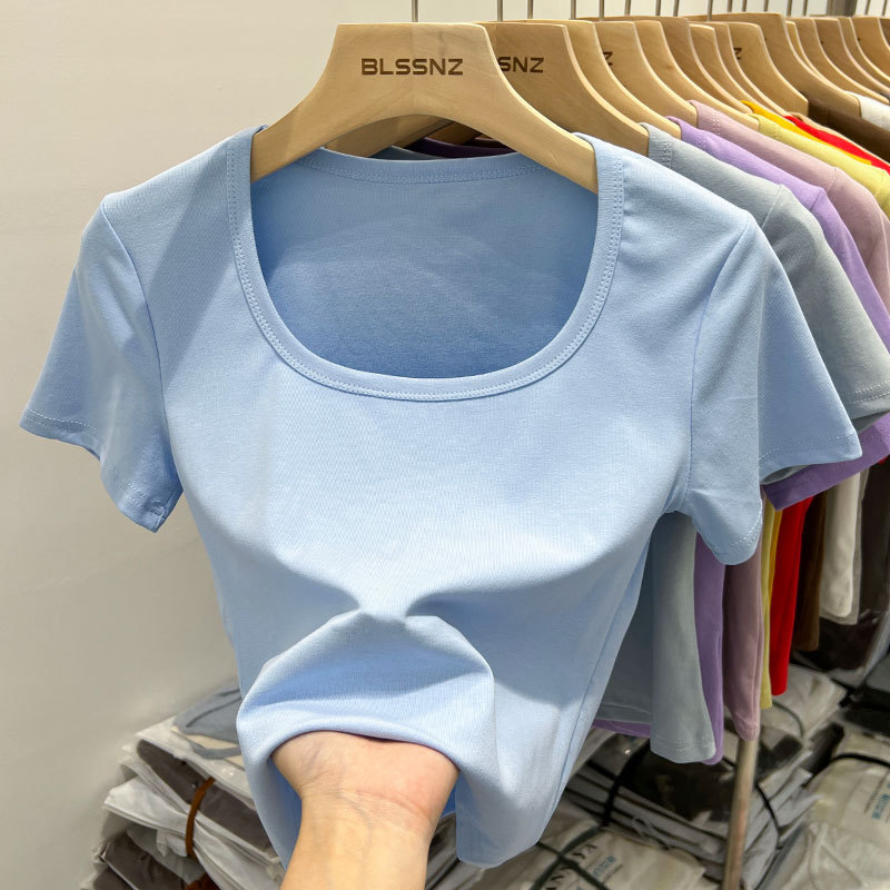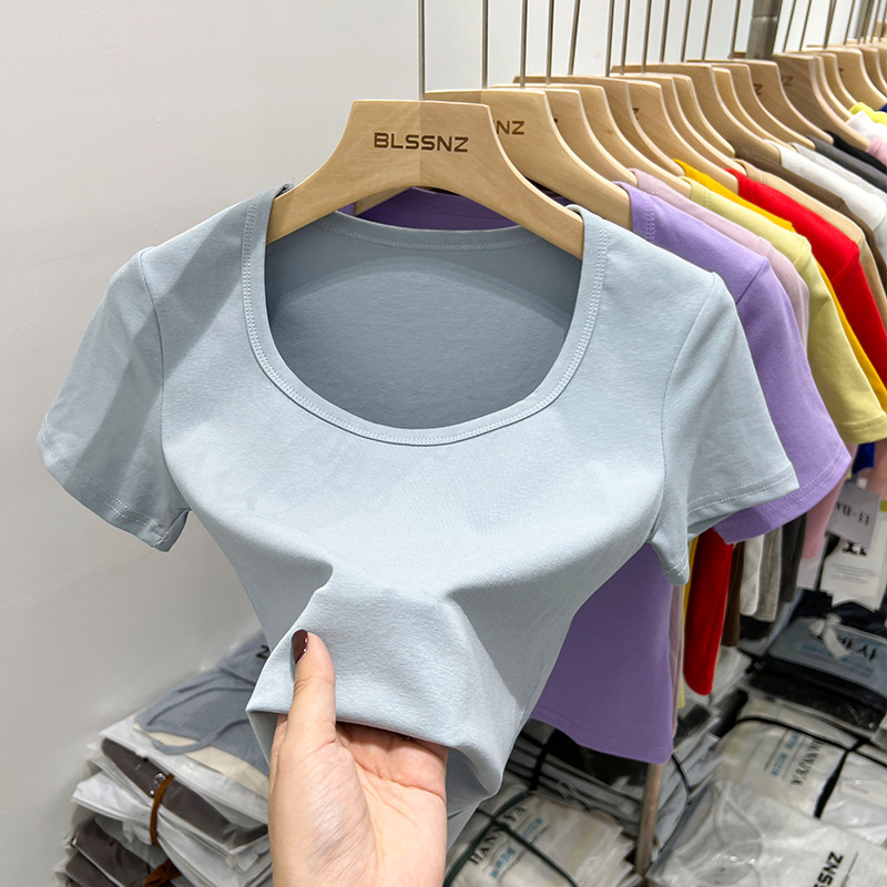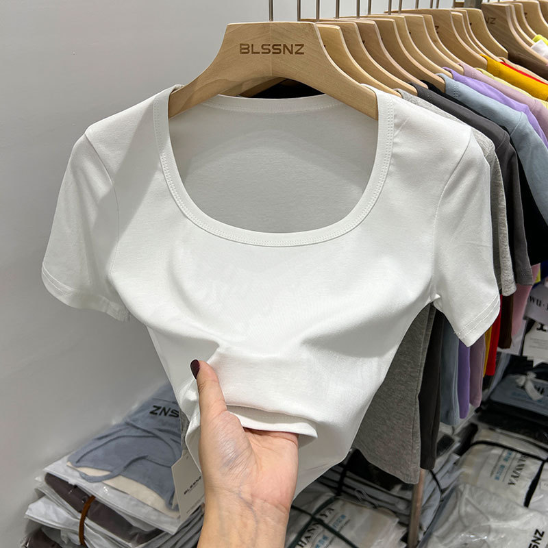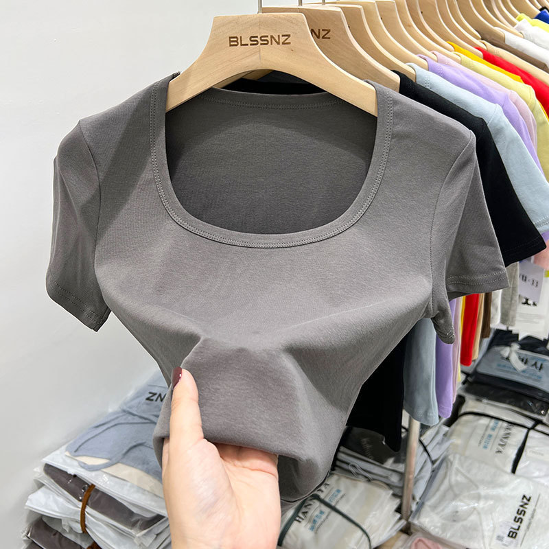短袖t恤女夏装新款纯欲露锁骨方领热辣短款上衣女体恤潮