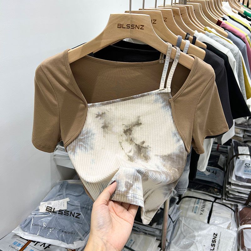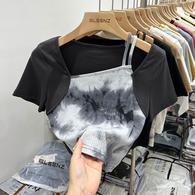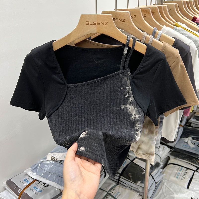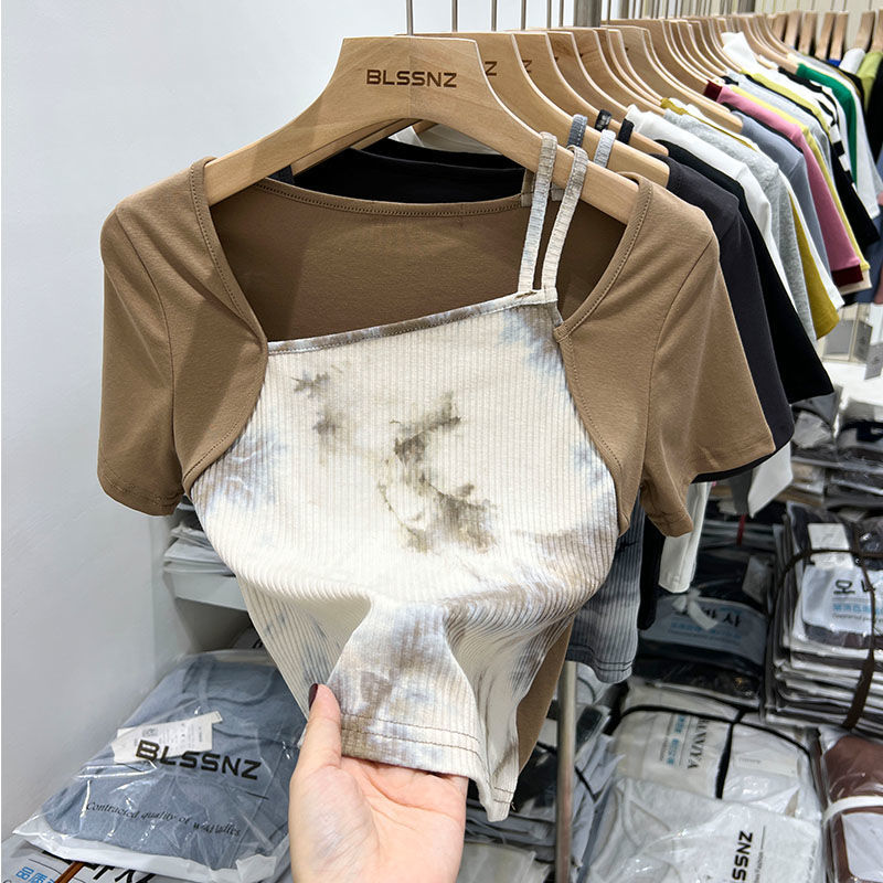 纯欲扎染短袖t恤女短款小众夏时尚辣妹独特别致方领上衣女设计感
