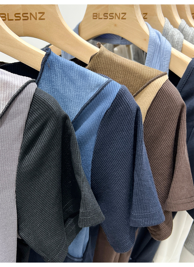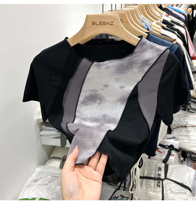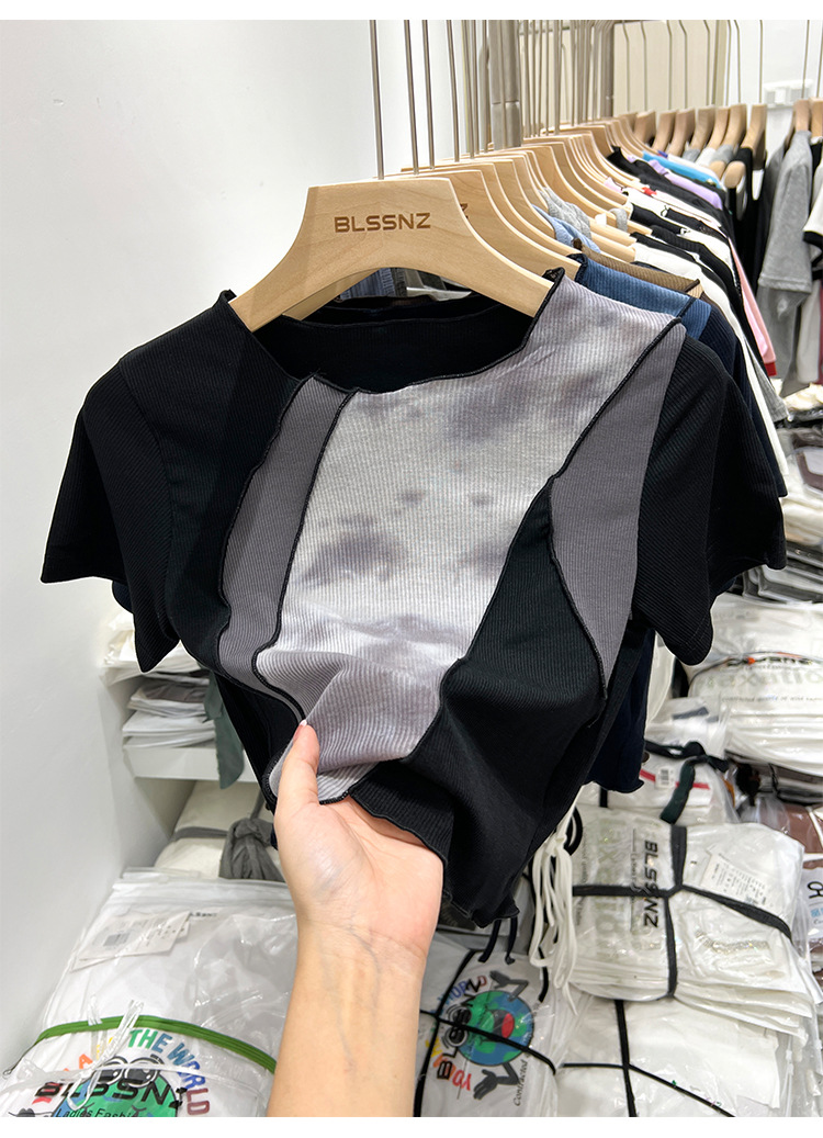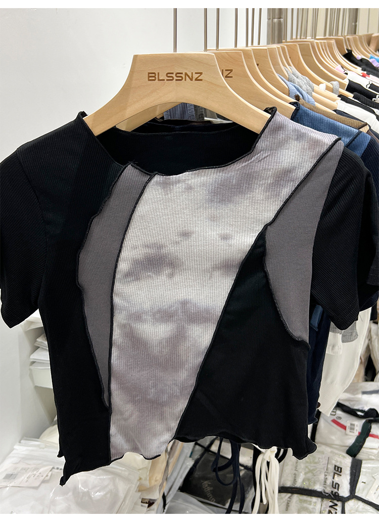 不规则撞色短袖t恤女ins潮木耳边短款高腰露脐设计感小众上衣