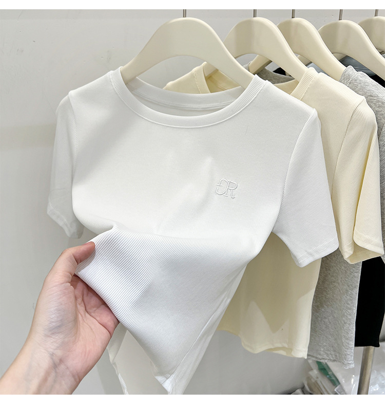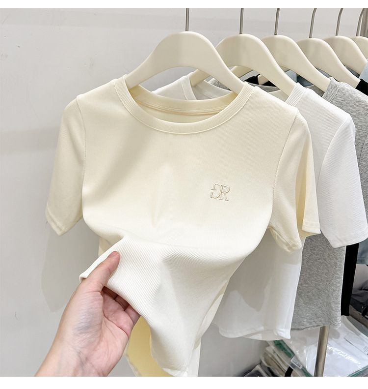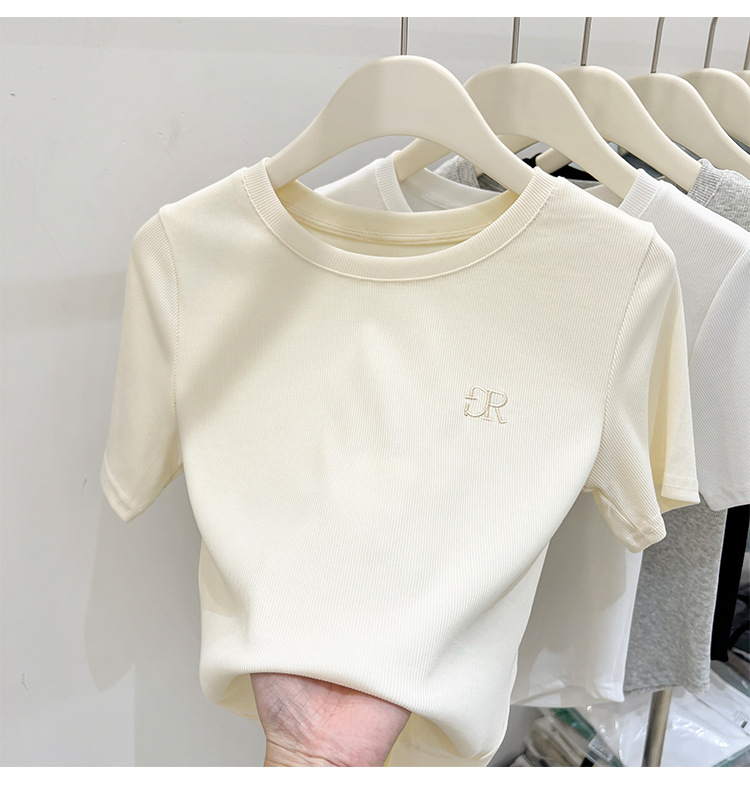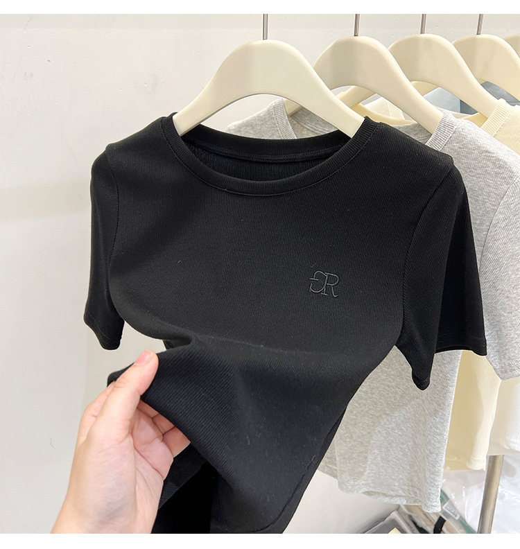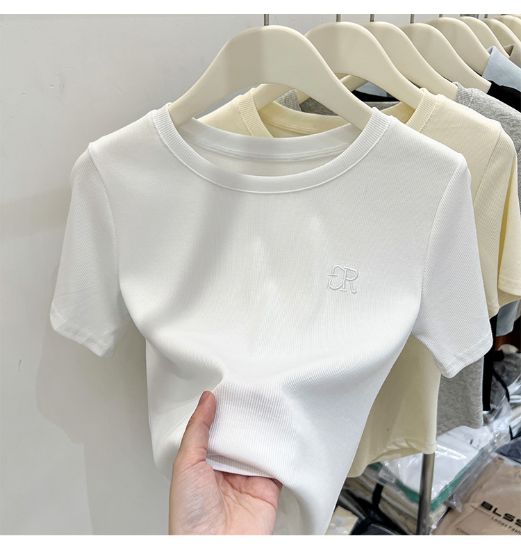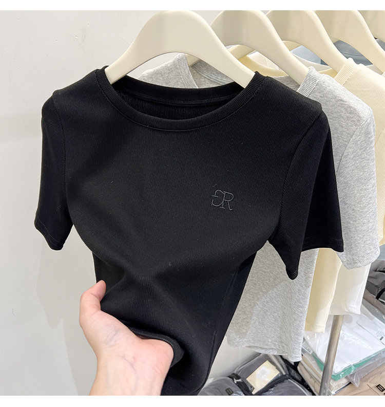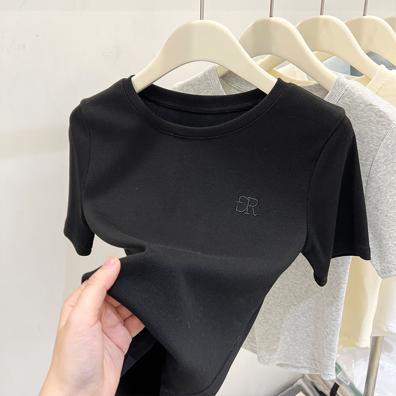刺绣短袖t恤女正肩新款设计感夏装小众修身欧货上衣