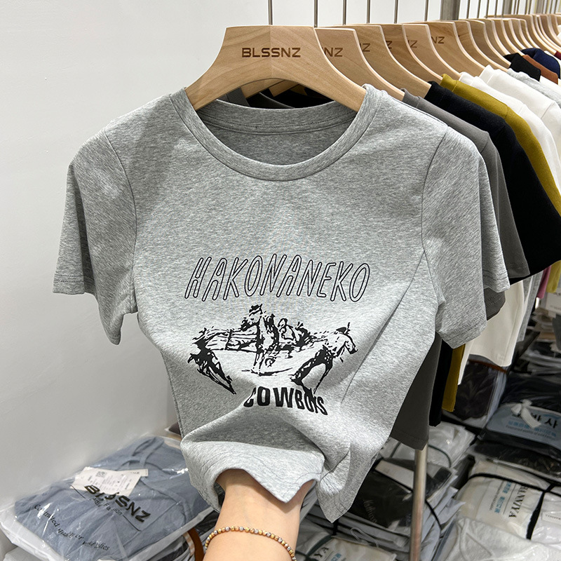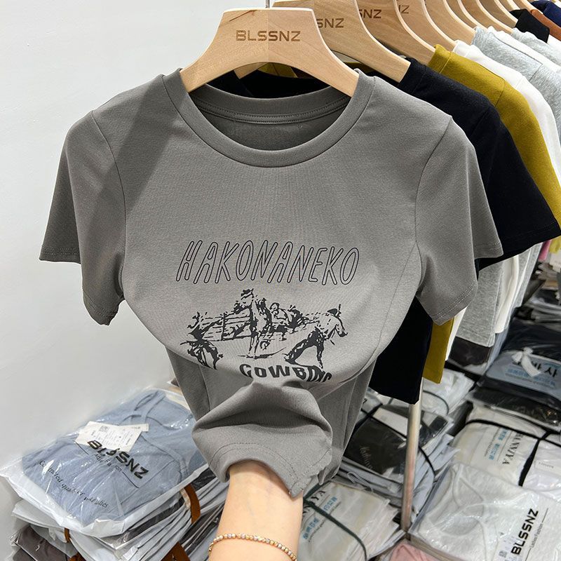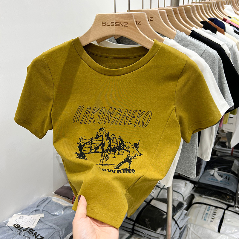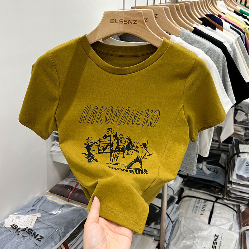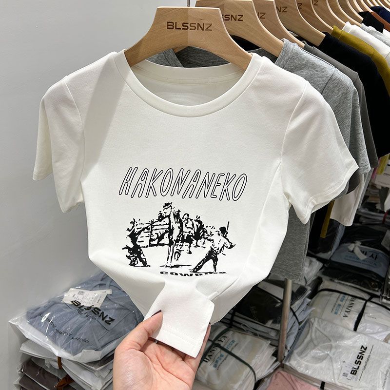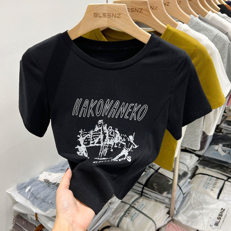 短袖t恤女ins潮夏装新款印花开叉独特别致设计感辣妹短款上衣