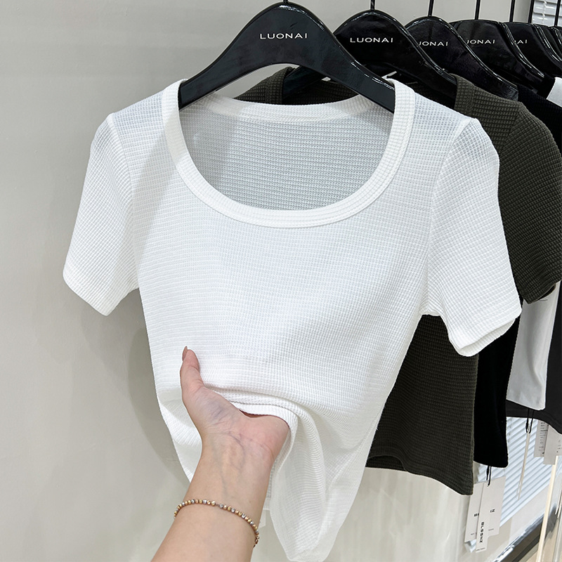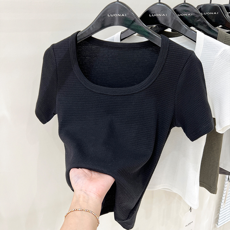 短袖t恤女新款华夫格小衫女锁骨方领上衣女潮