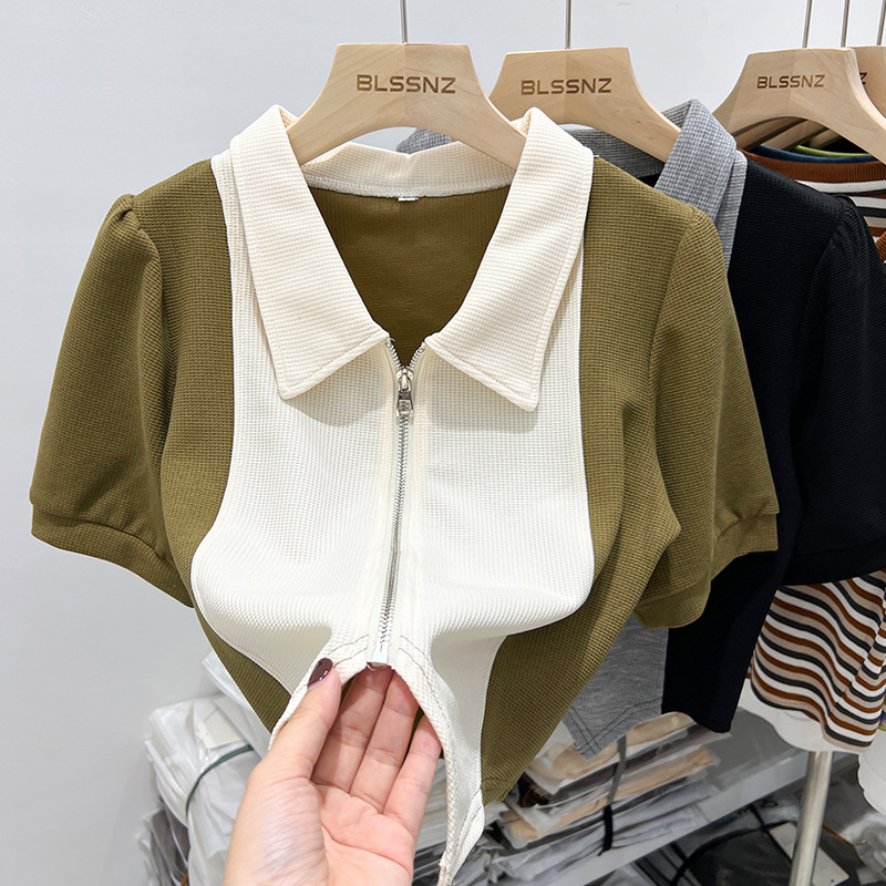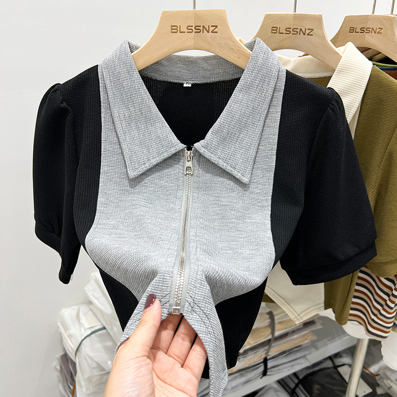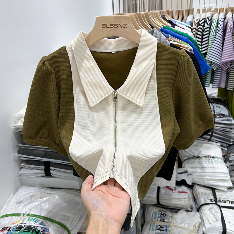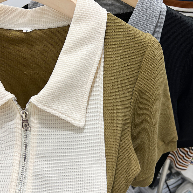 华夫格polo领短款上衣设计感小众拼接短袖t恤女显瘦百搭