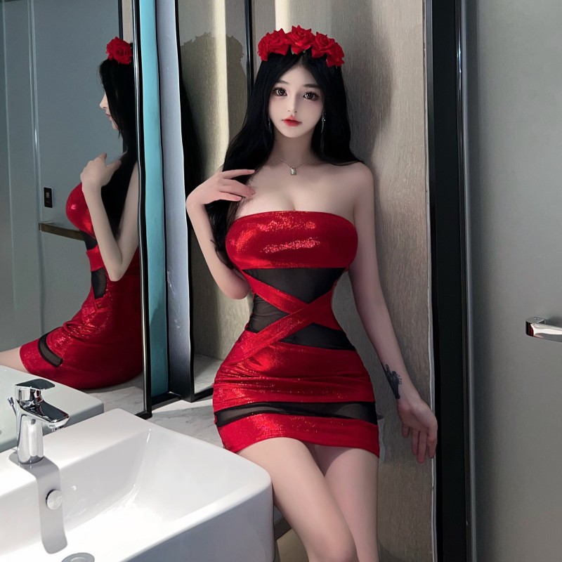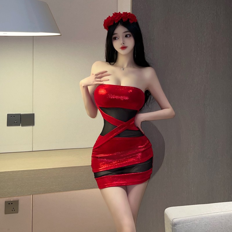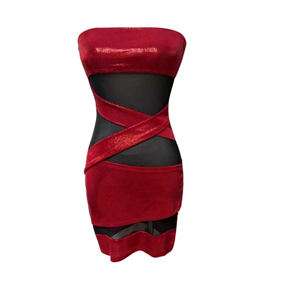 年会战袍露肩抹胸拼接弹力红色性感辣妹裹胸短裙紧身包臀连衣裙女