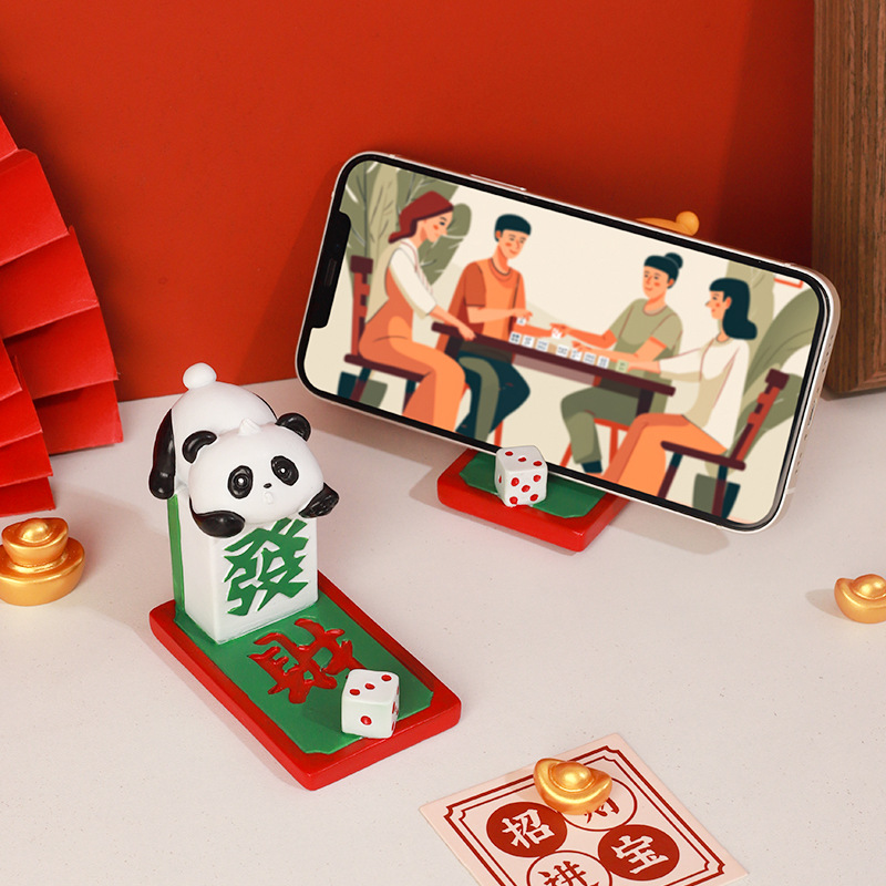 桌面树脂手机架国潮卡通熊猫麻将趣味装饰品手机支撑架