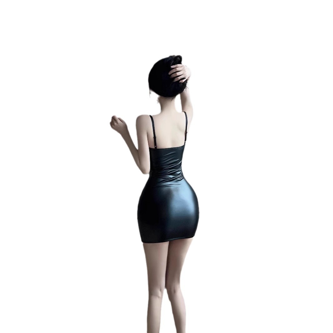 设计感气质纯欲褶皱低胸辣妹吊带性感紧身pu皮包臀露背连衣裙女