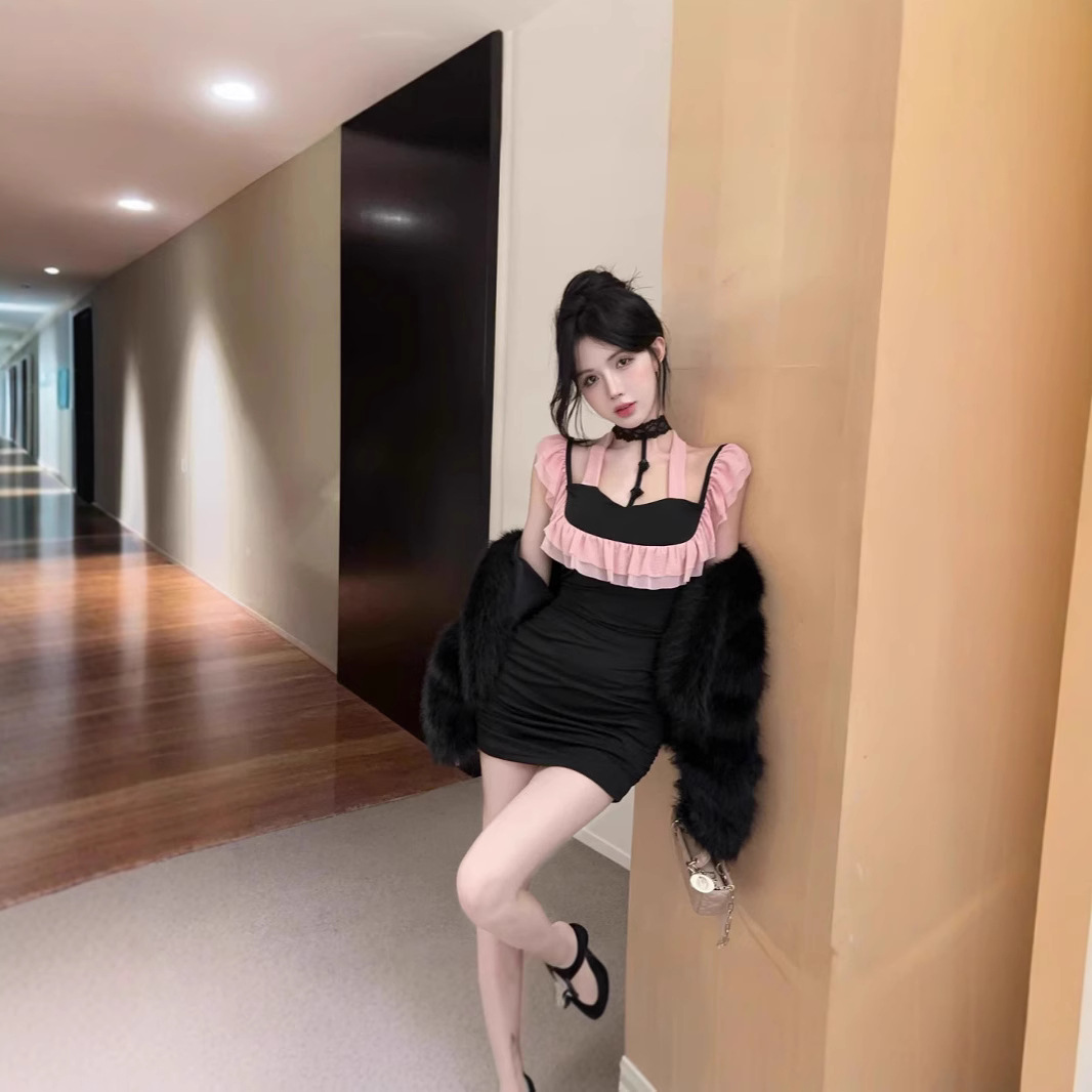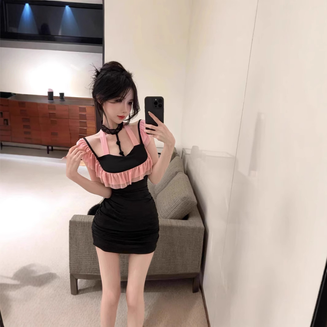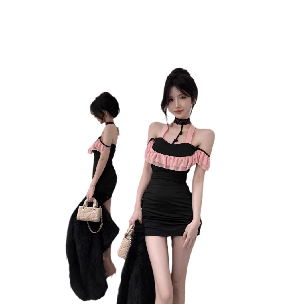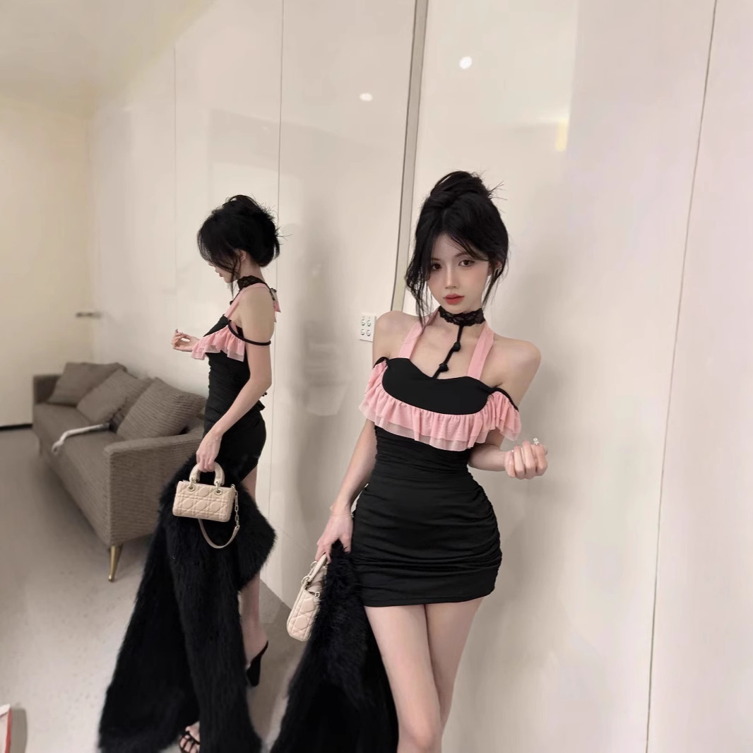 设计感气质荷叶边挂脖辣妹纯欲无袖拼接修身包臀性感主播连衣裙女