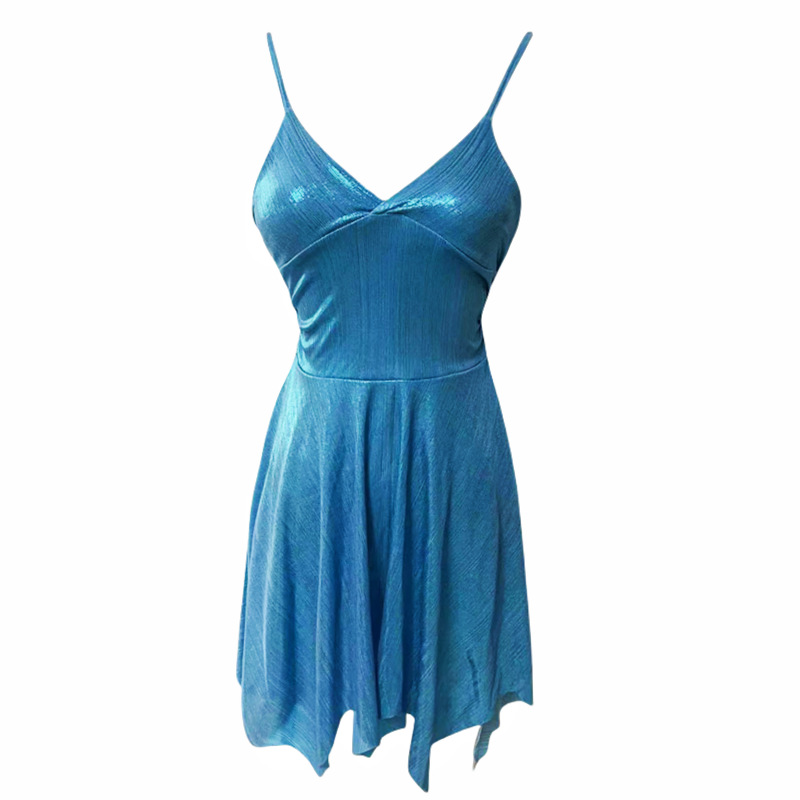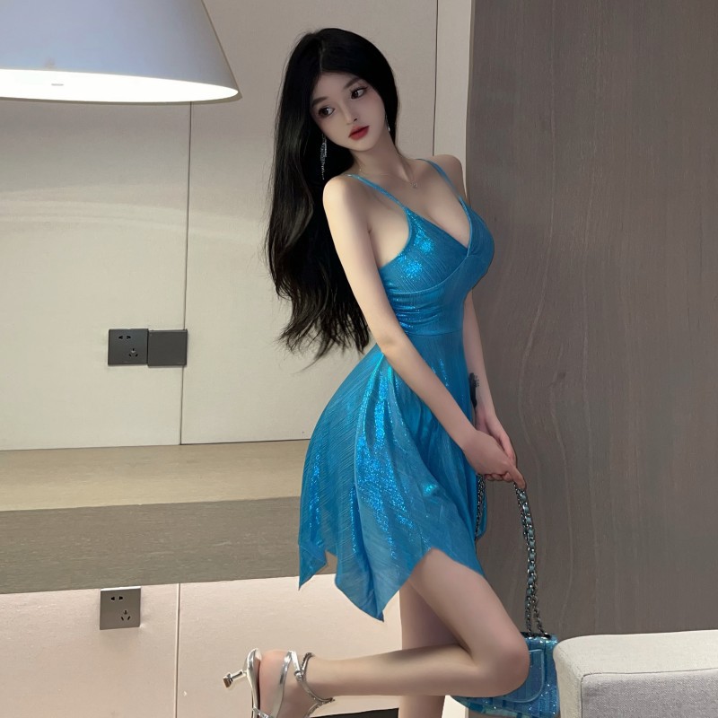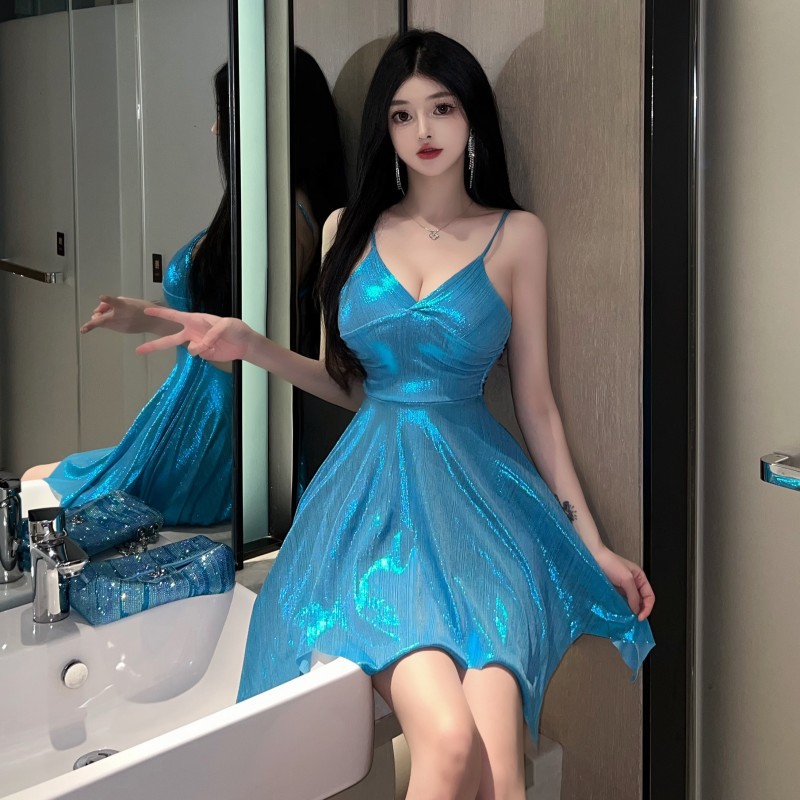 性感夜店舞台烫金亮面闪闪v领低胸大摆吊带短裙收腰显瘦连衣裙女