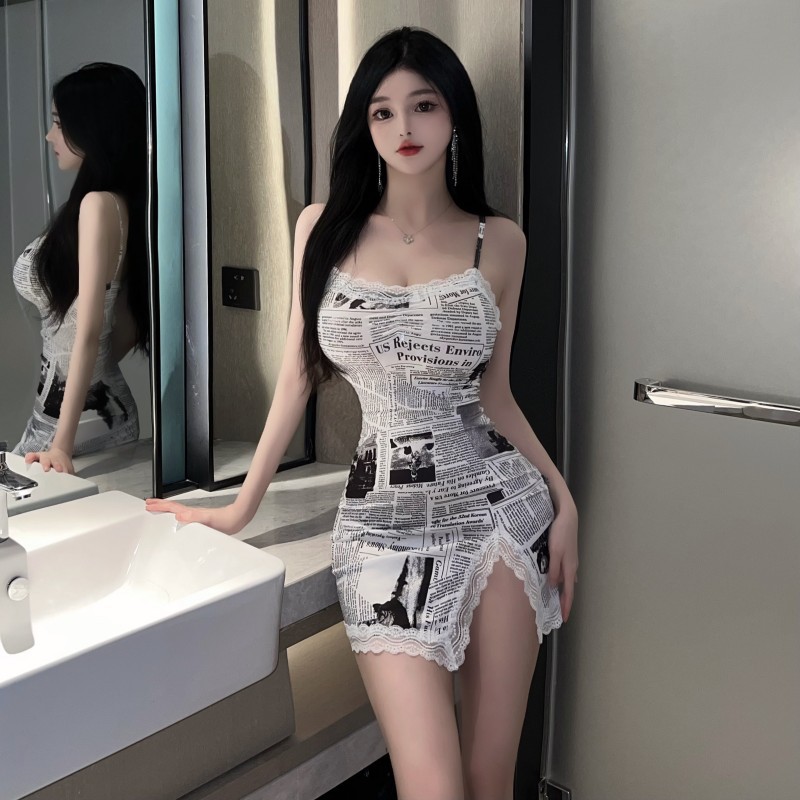 性感辣妹欧美设计感报纸印花蕾丝边开叉吊带短裙修身包臀连衣裙女