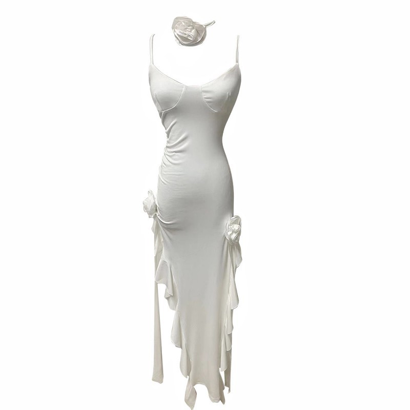 纯欲气质性感辣妹低胸花朵不规则度假白色长裙开叉荷叶边连衣裙女