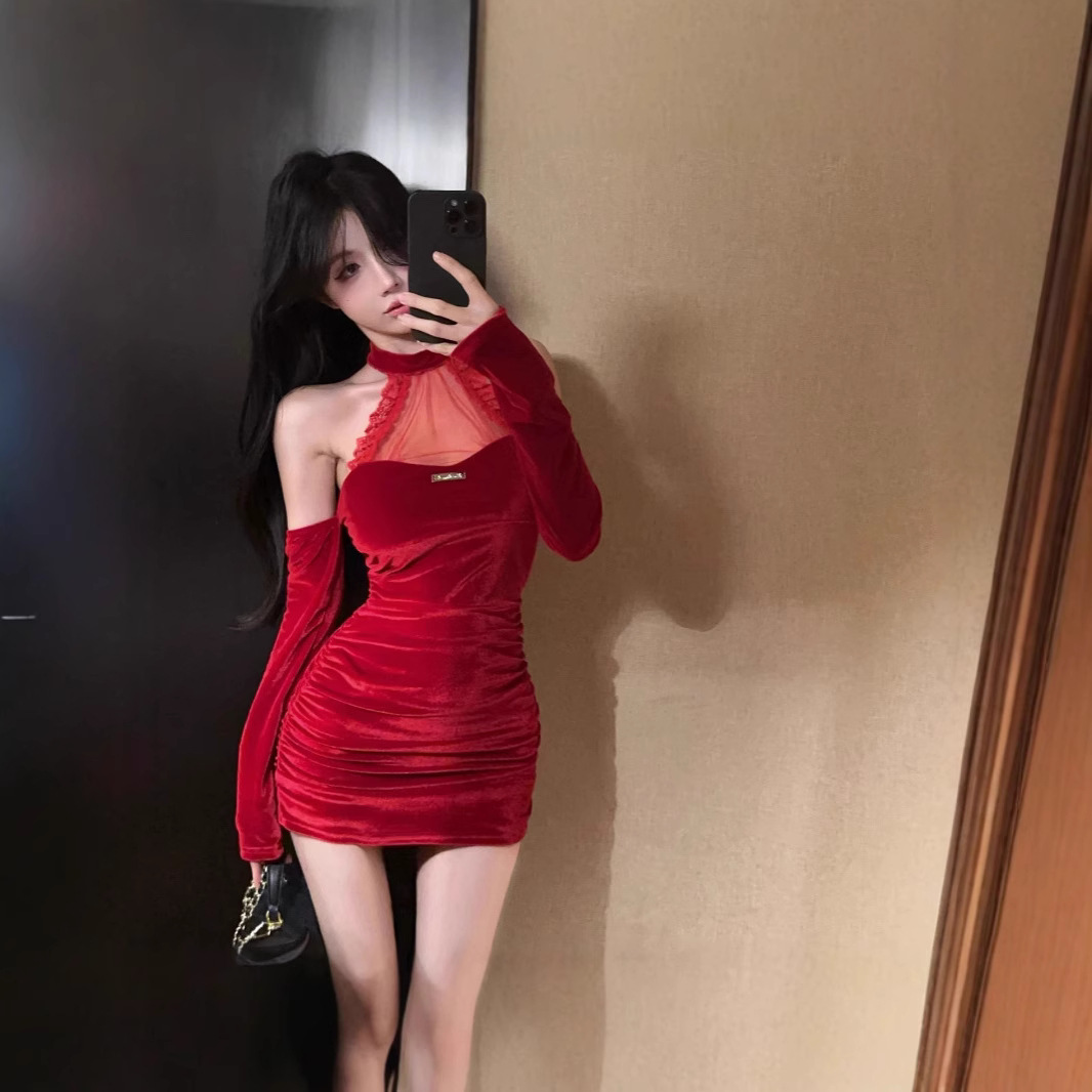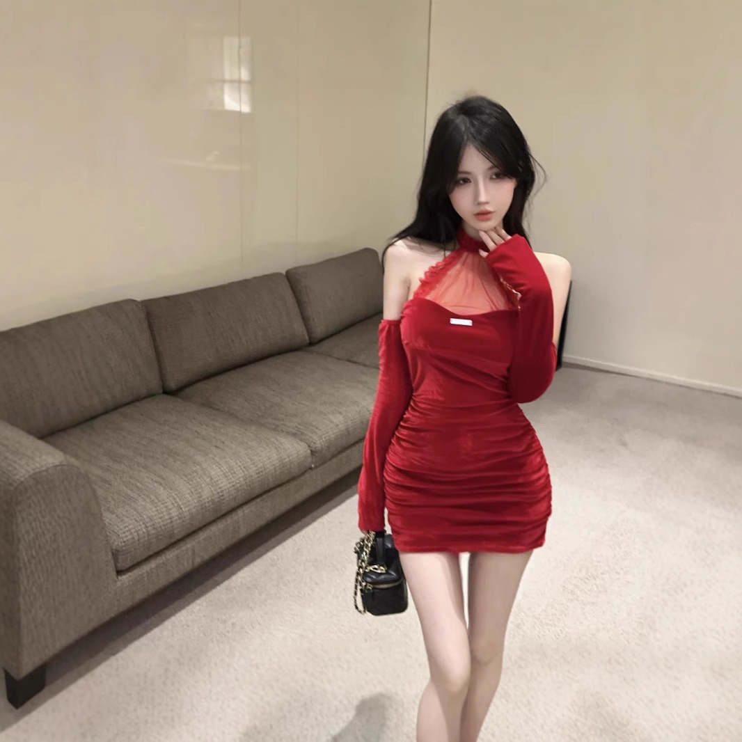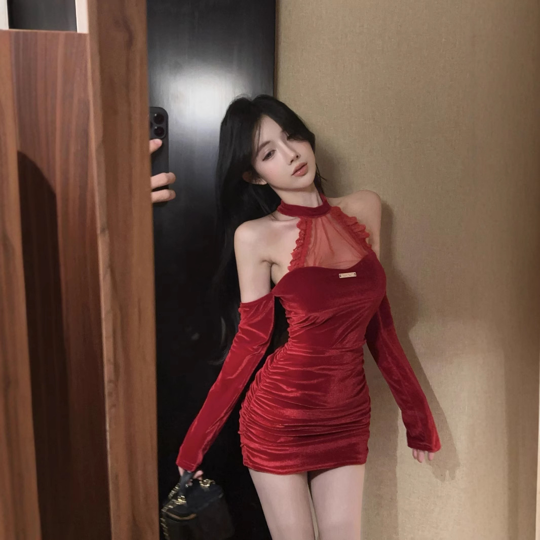 设计感纯欲气质挂脖网纱蕾丝花边褶皱露肩辣妹性感修身包臀连衣裙
