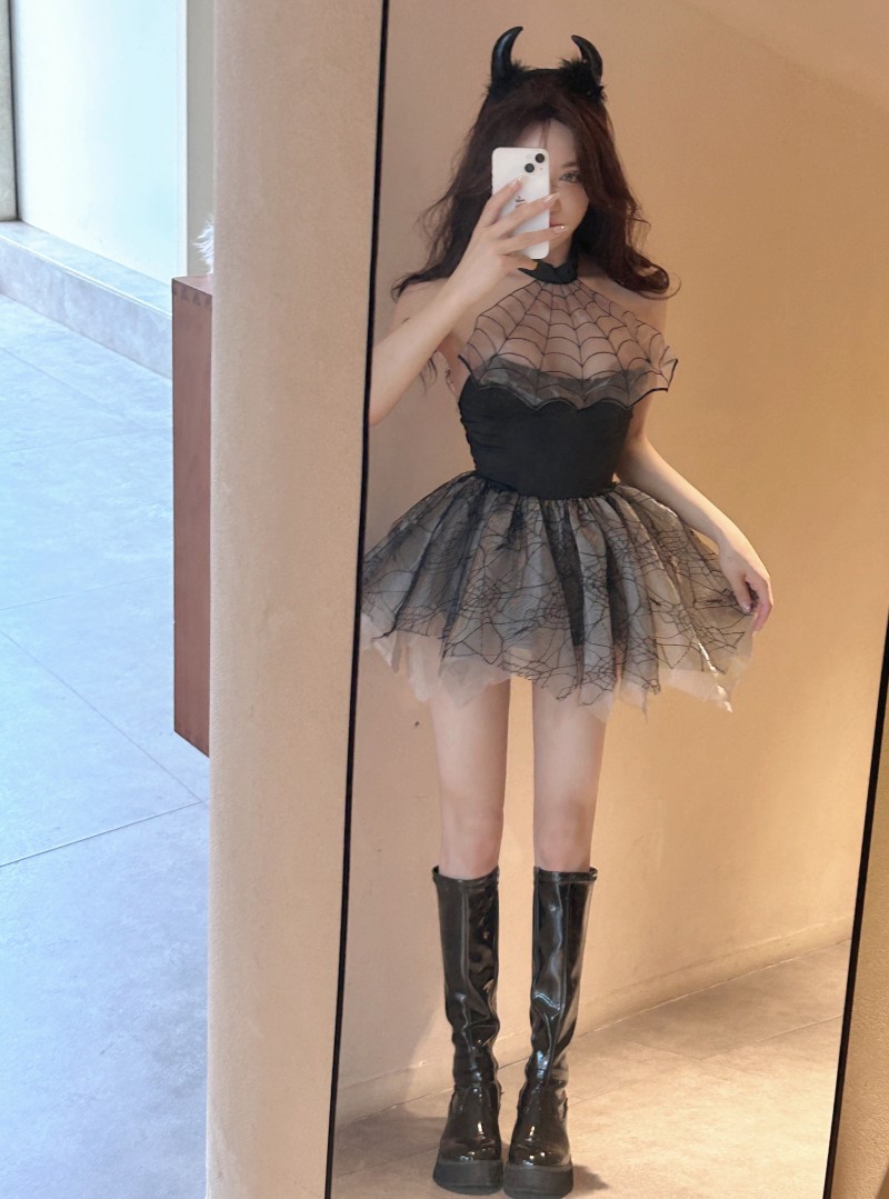 蜘蛛网挂脖露背夜店性感辣妹超短大摆蓬蓬小黑裙修身收腰连衣裙女