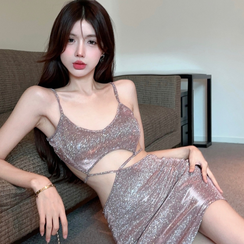 欧美新款时尚网红辣妹减龄镂空吊带修身显瘦纯欲高级温泉连体泳衣