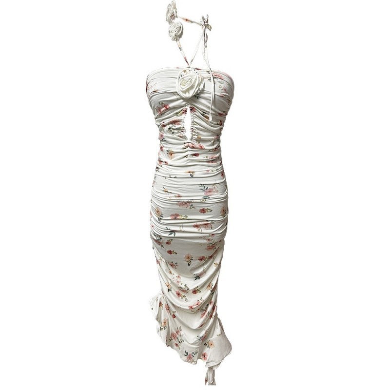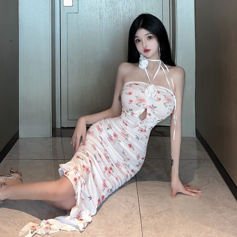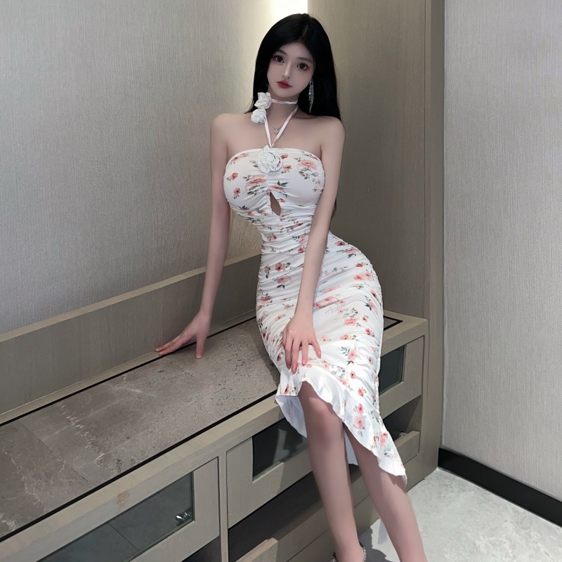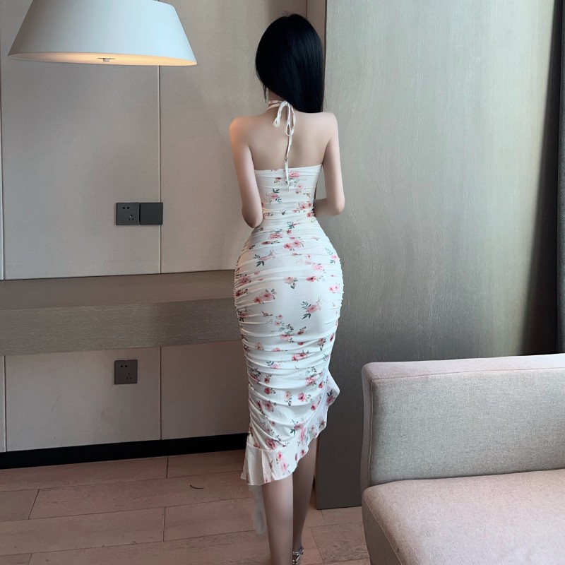 性感纯欲抹胸挂脖碎花褶皱荷叶边紧身礼服包臀连衣裙