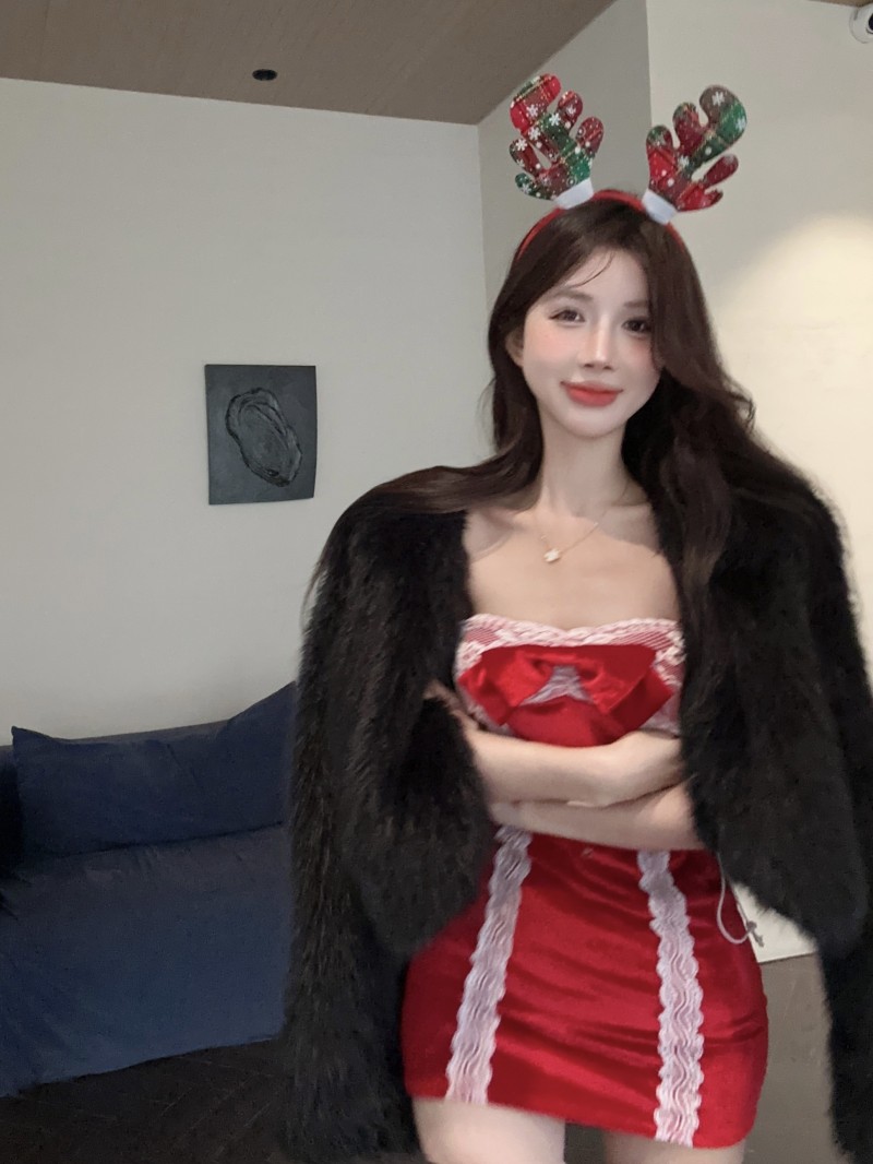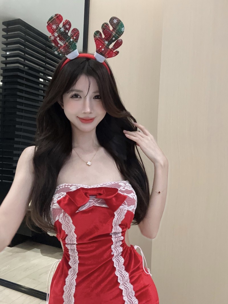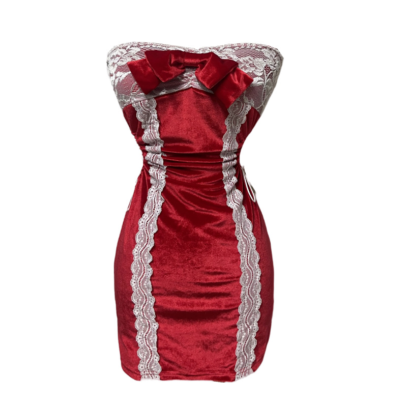 性感辣妹圣诞氛围镂空露腰蕾丝拼接丝绒抹胸短裙修身包臀连衣裙女