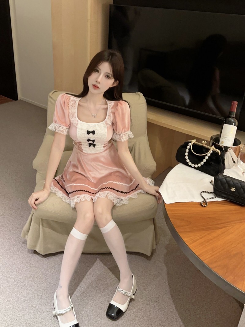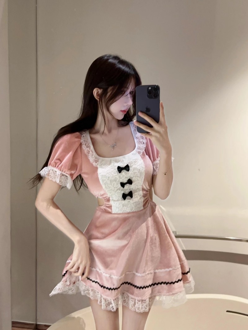 洛丽塔可爱性感风纯欲蕾丝拼接粉色丝绒公主短裙修身收腰连衣裙女