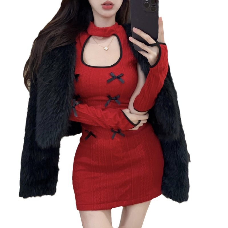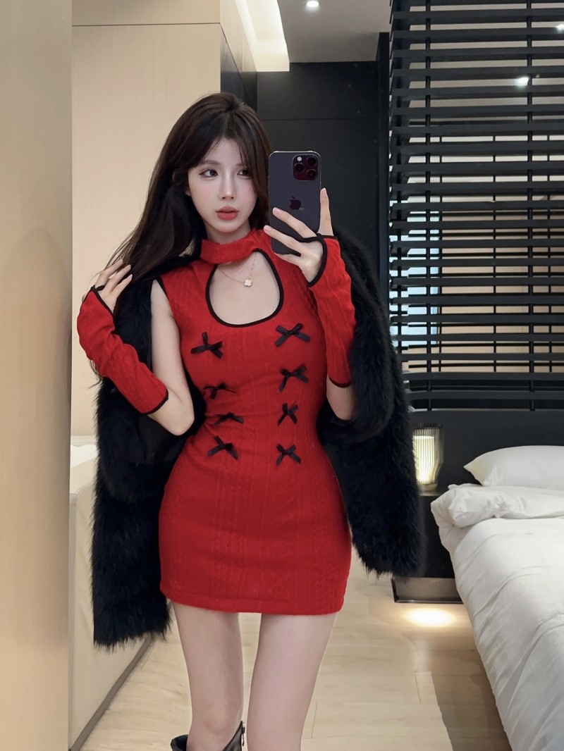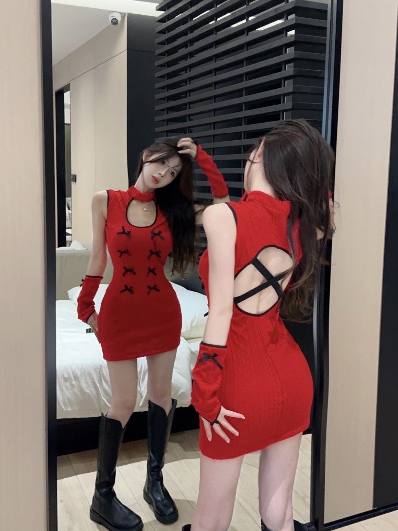 性感风辣妹红色小众设计蝴蝶结镂空低胸袖套短裙修身包臀连衣裙女
