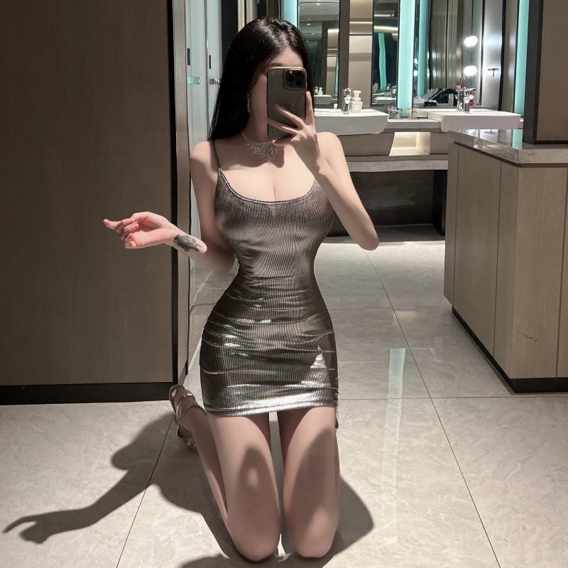 网红性感辣妹夜店亮面吊带紧身包臀短裙连衣裙女