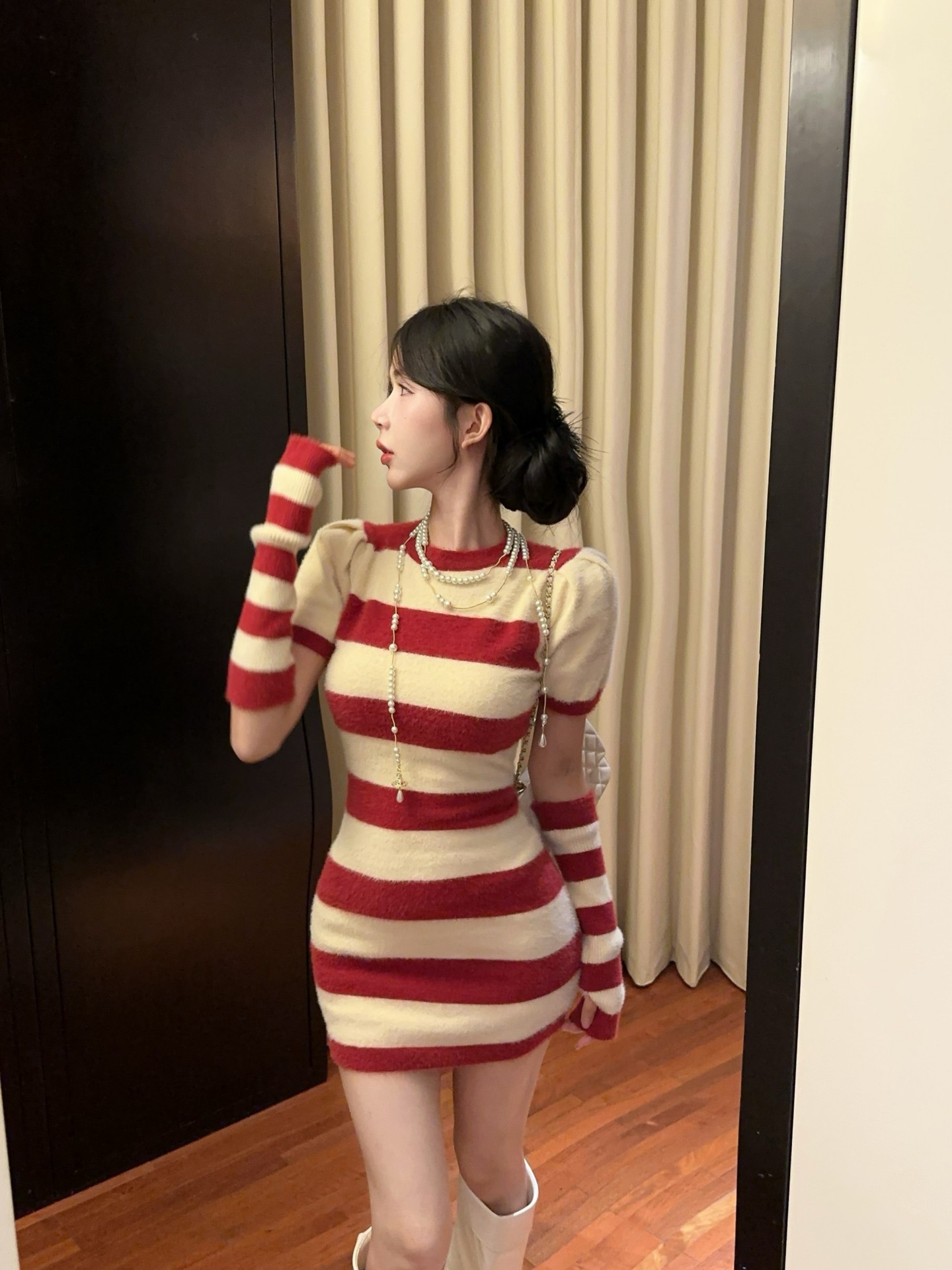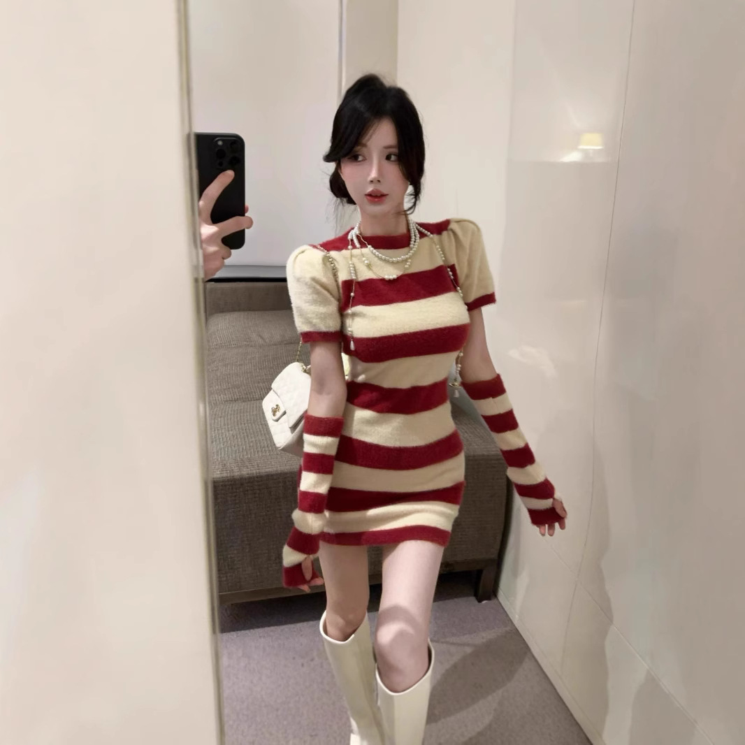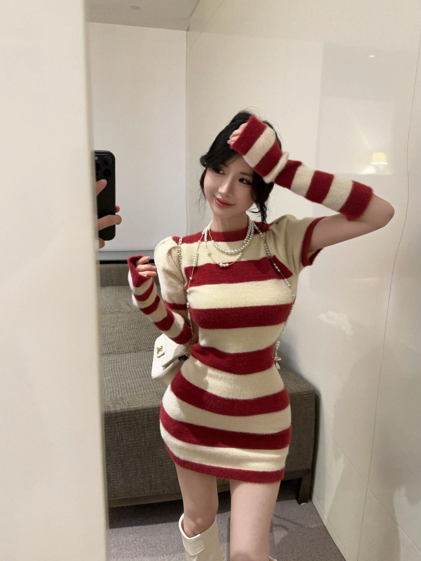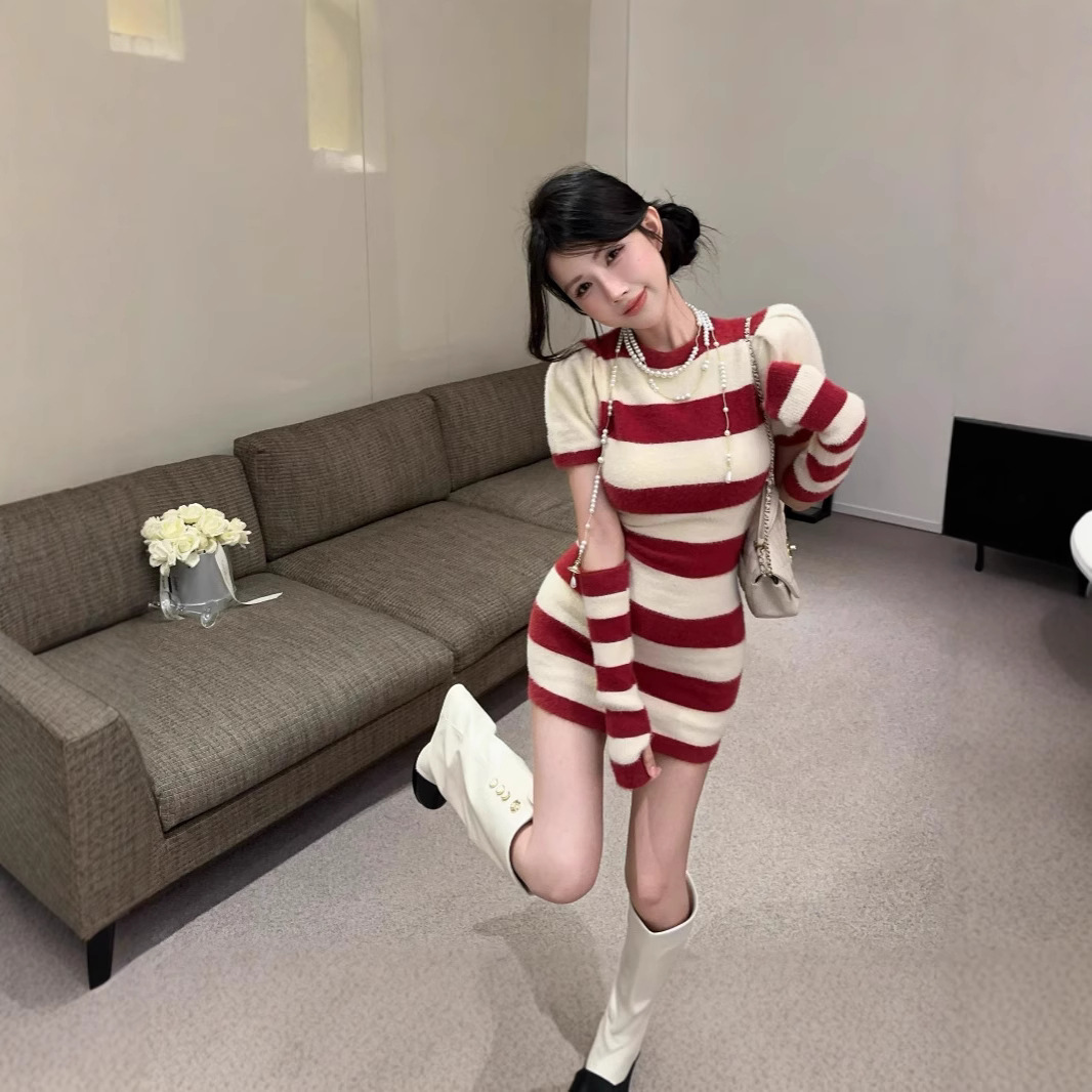 设计感针织加厚毛衣辣妹时尚断袖红白拼接条纹纯欲可爱修身连衣裙