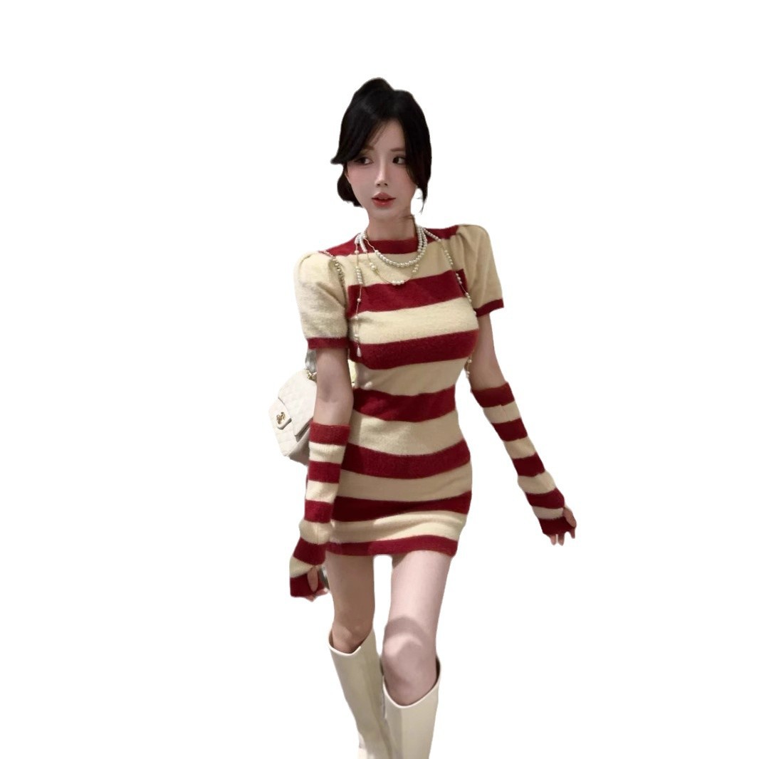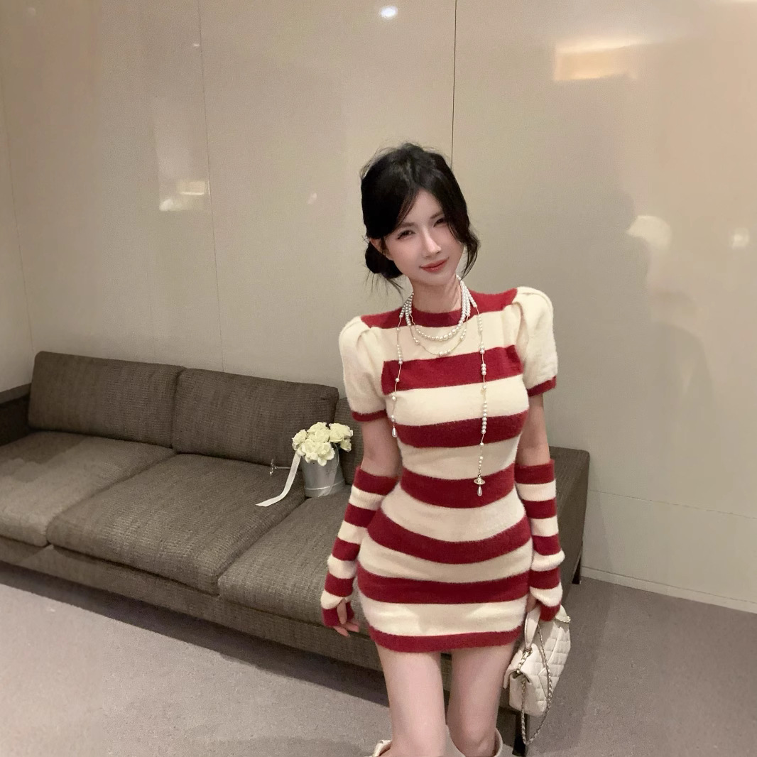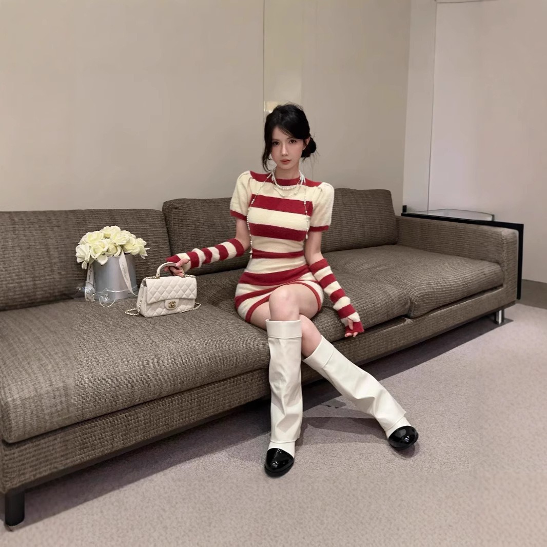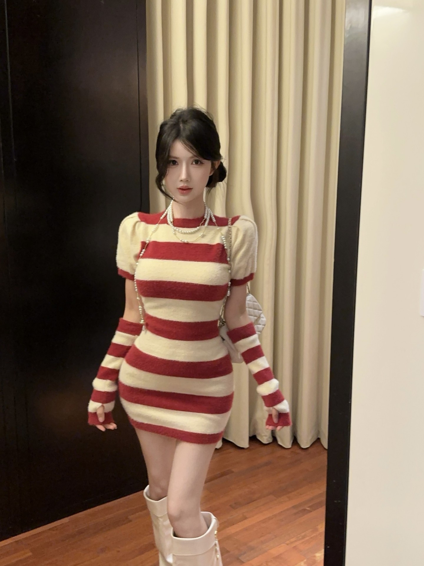 设计感针织加厚毛衣辣妹时尚断袖红白拼接条纹纯欲可爱修身连衣裙