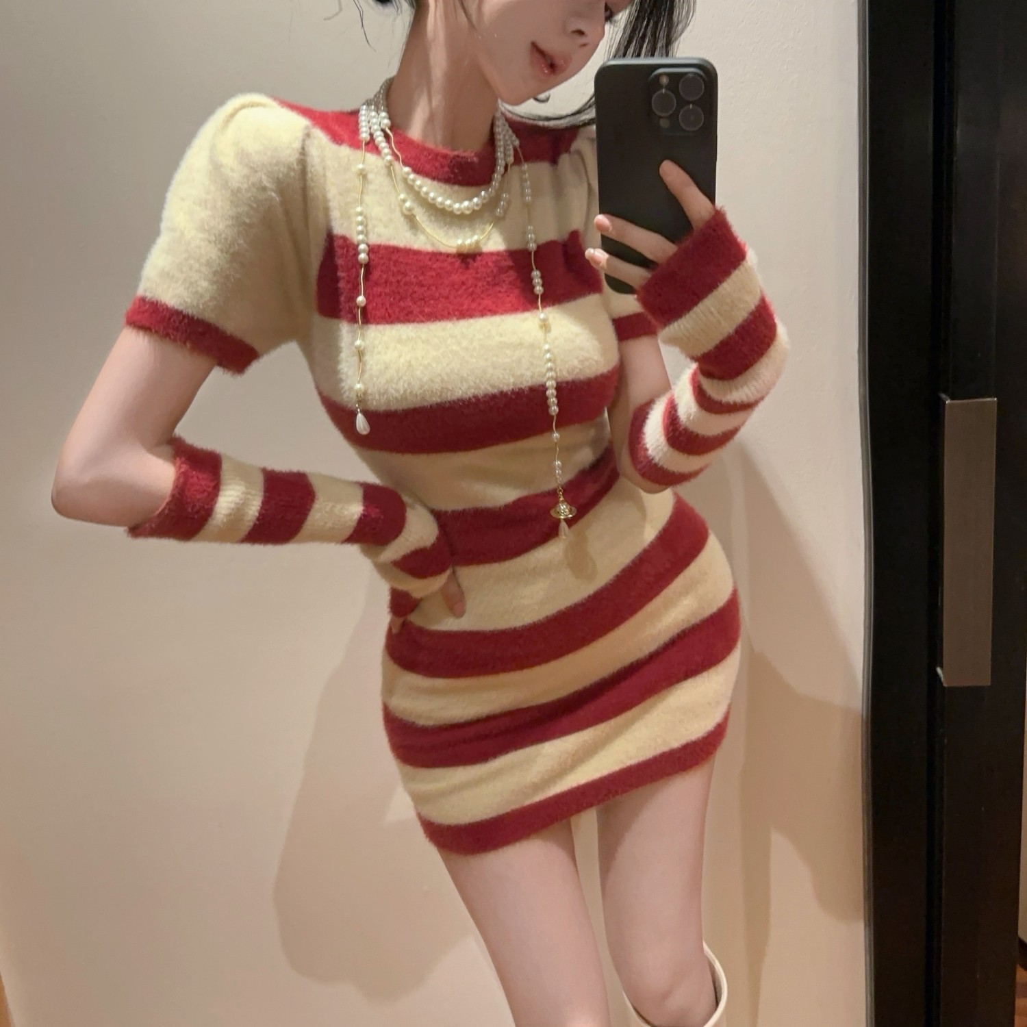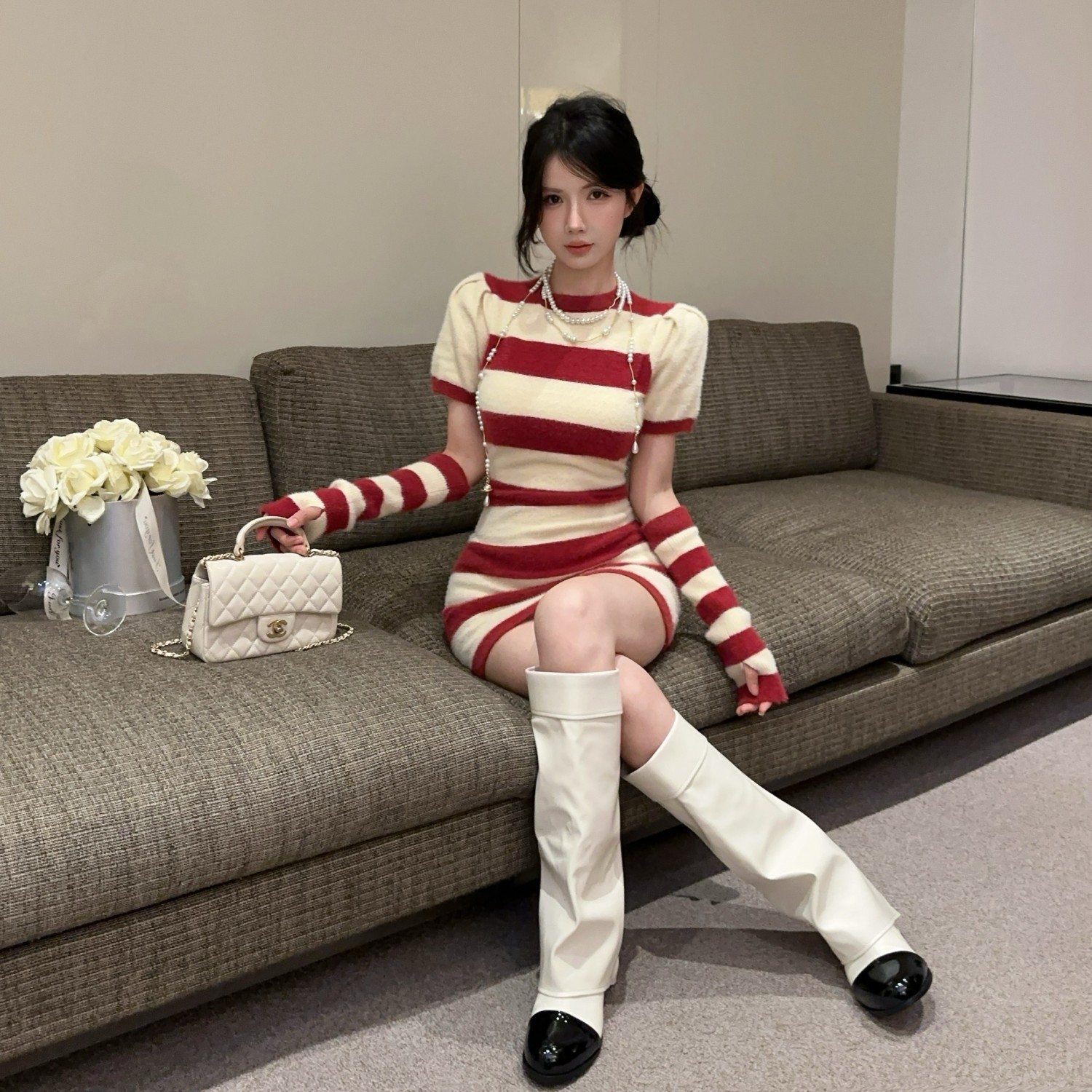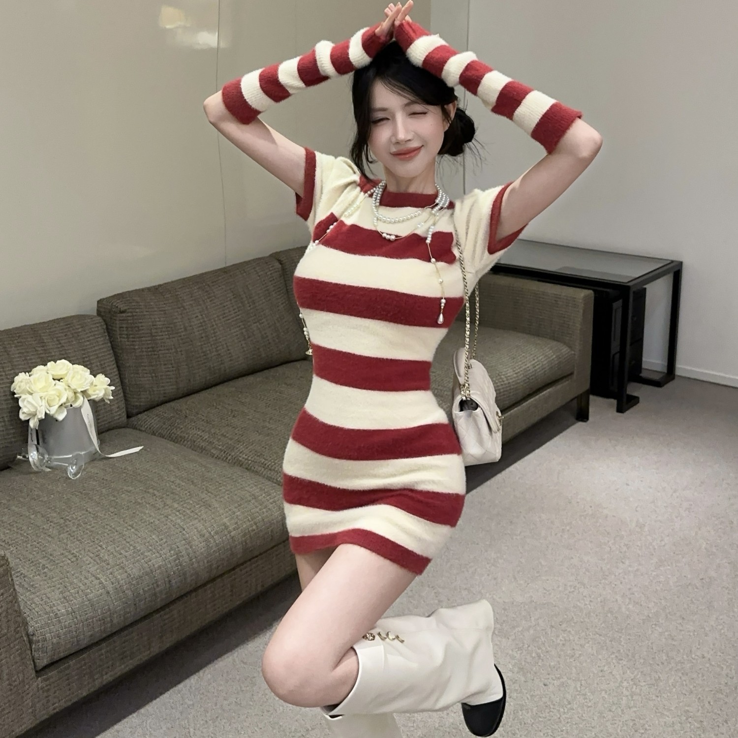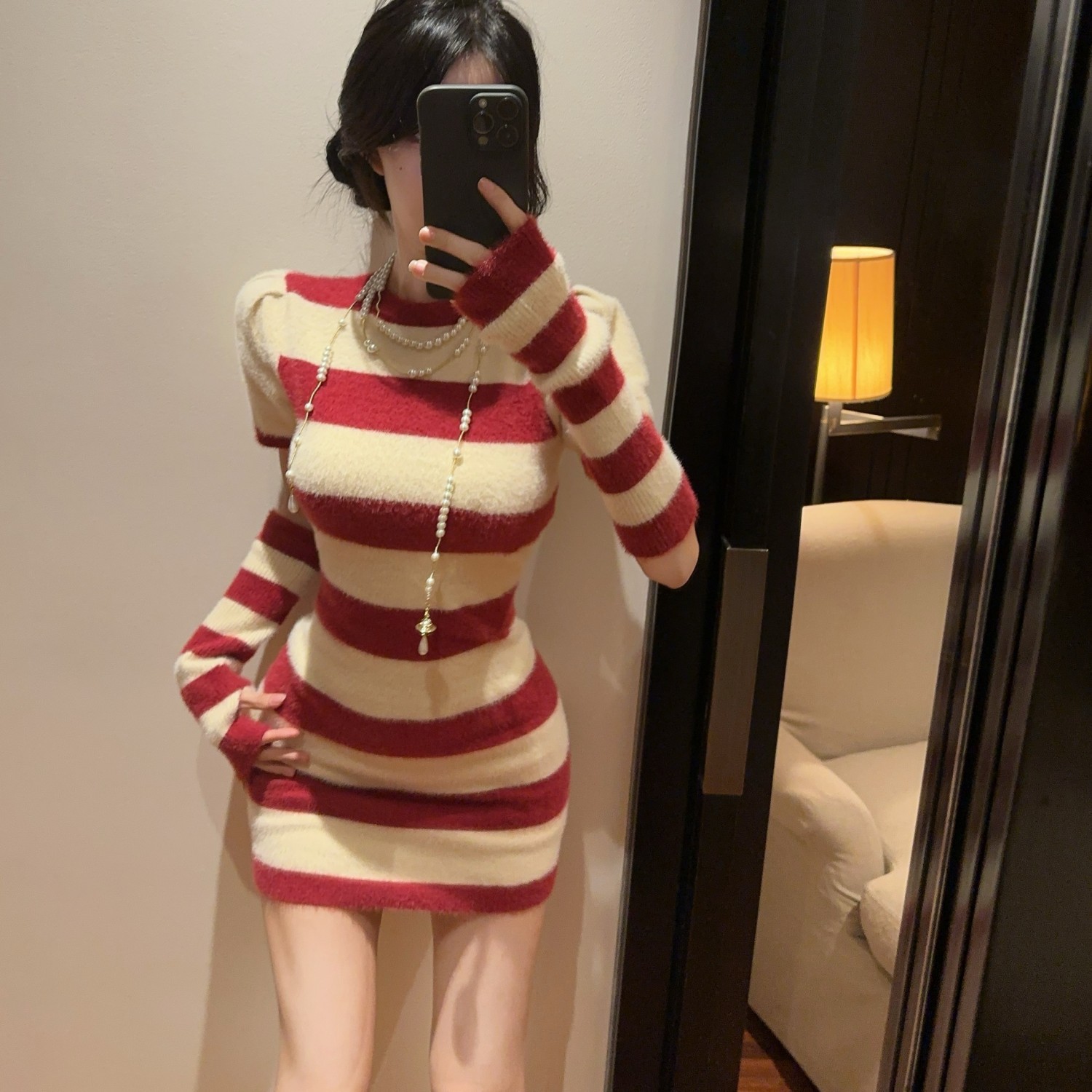 设计感针织加厚毛衣辣妹时尚断袖红白拼接条纹纯欲可爱修身连衣裙