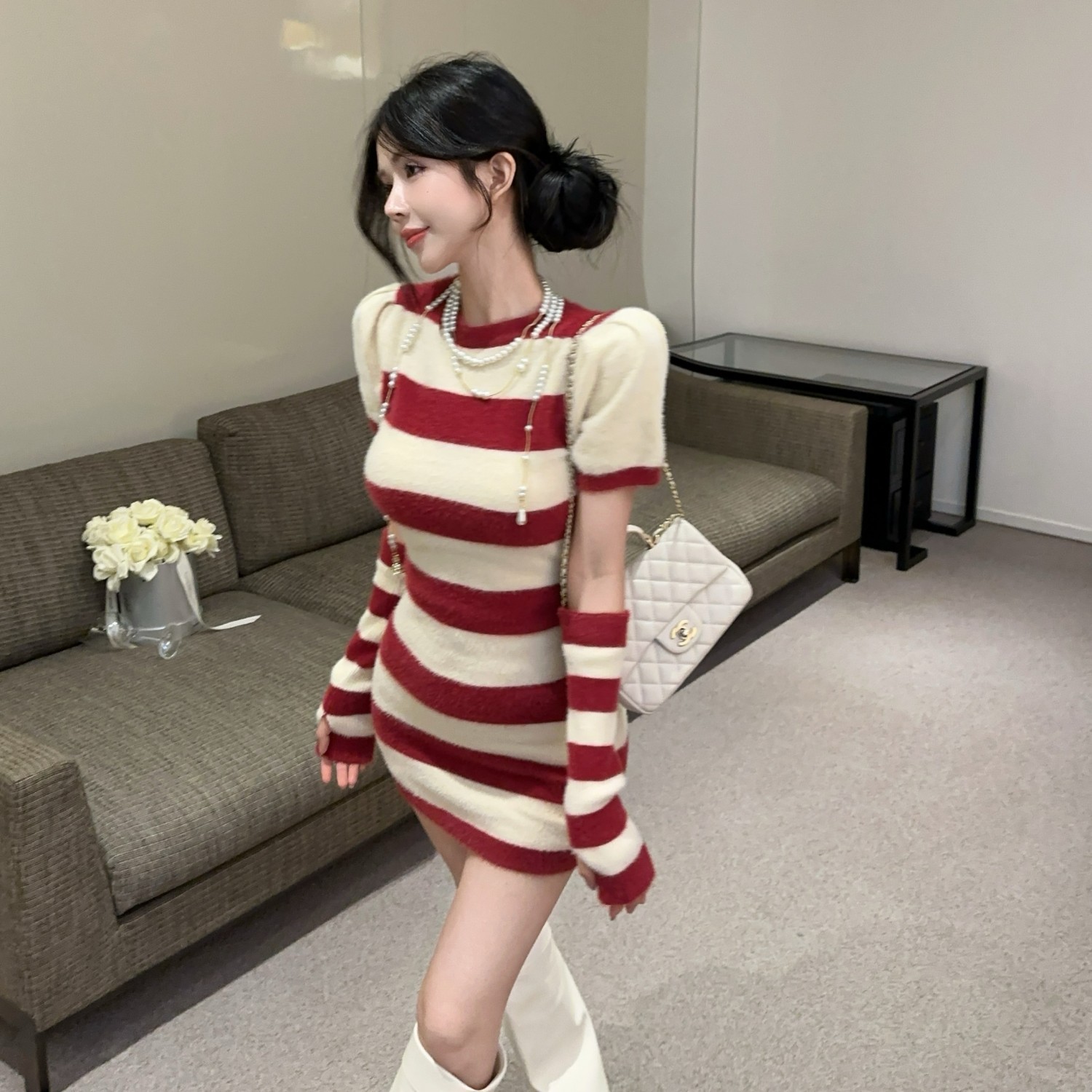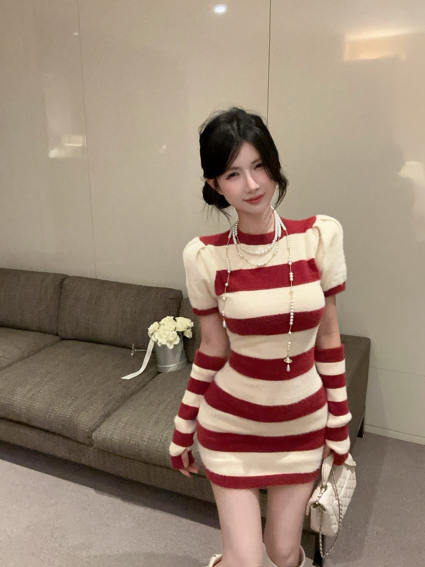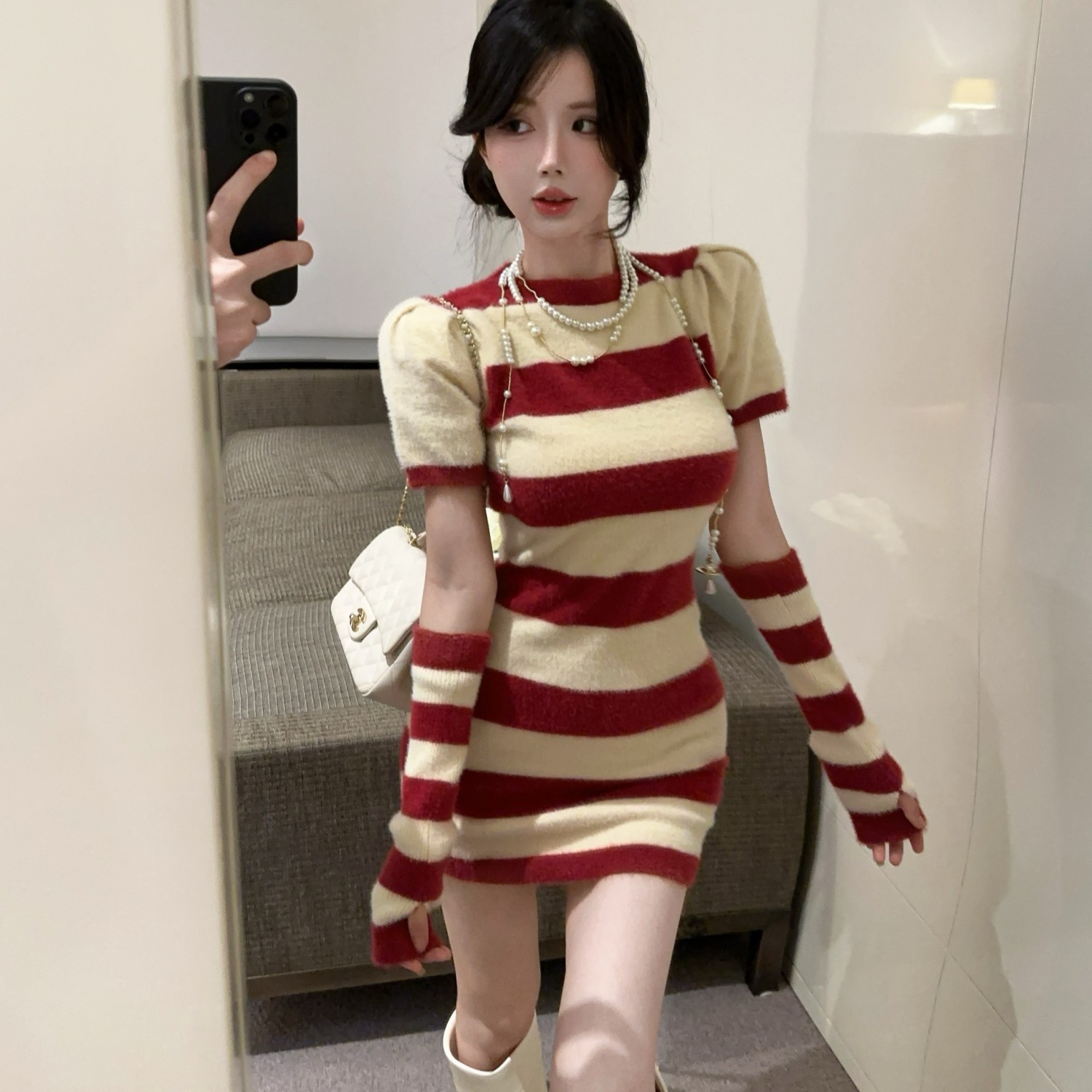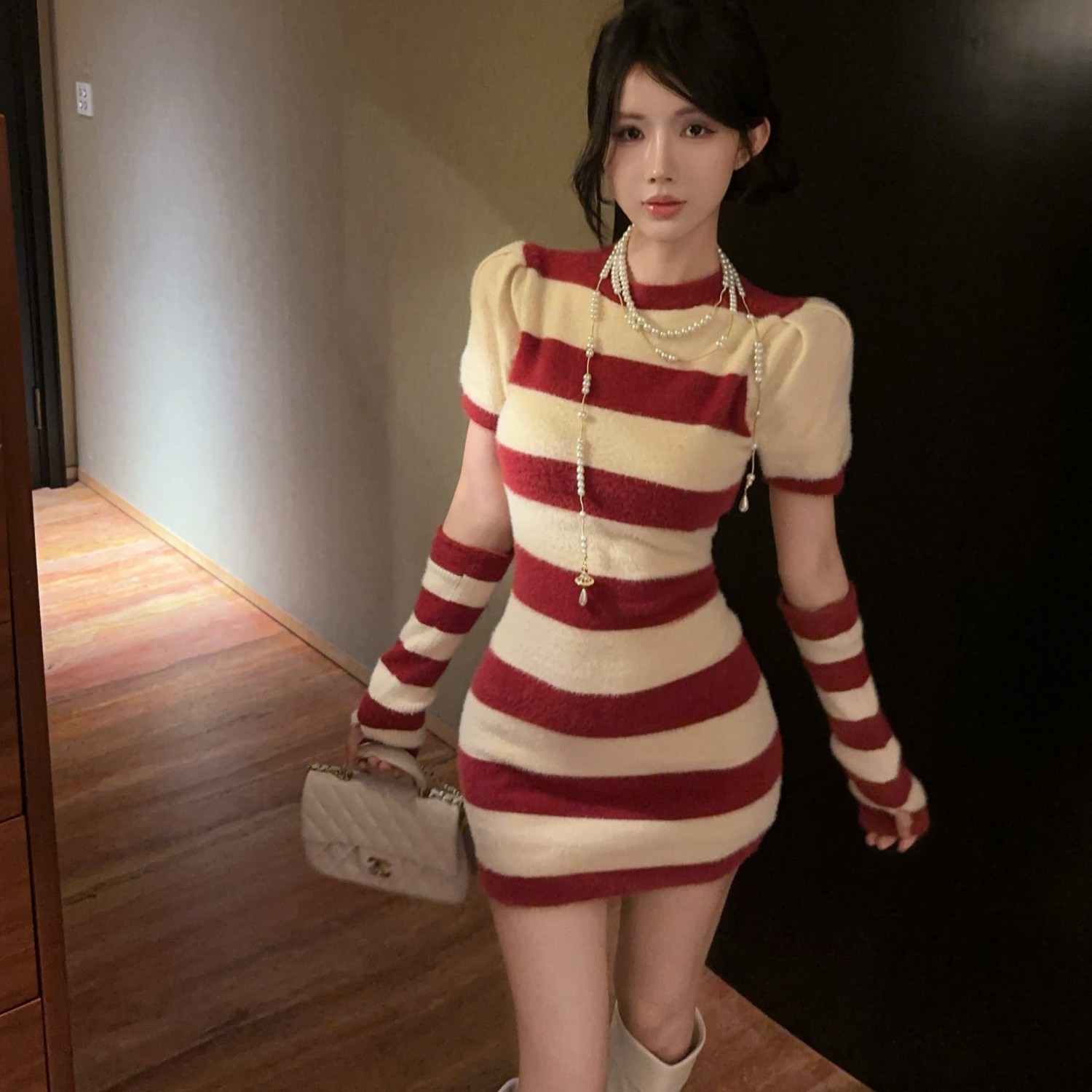 设计感针织加厚毛衣辣妹时尚断袖红白拼接条纹纯欲可爱修身连衣裙