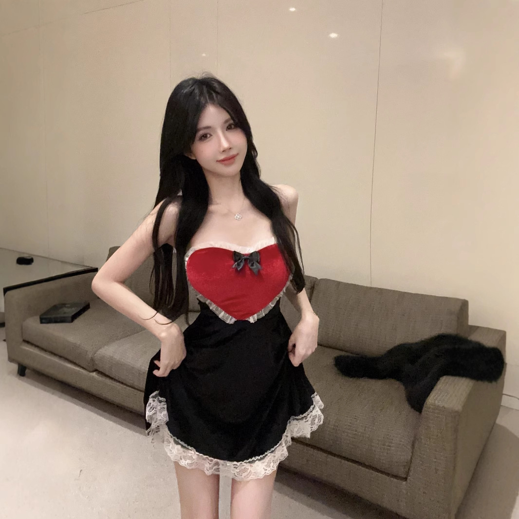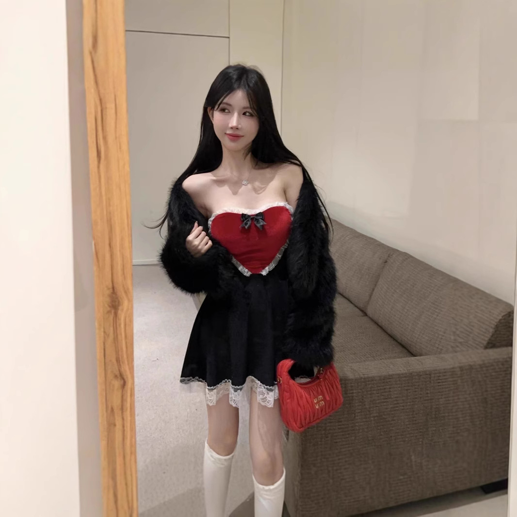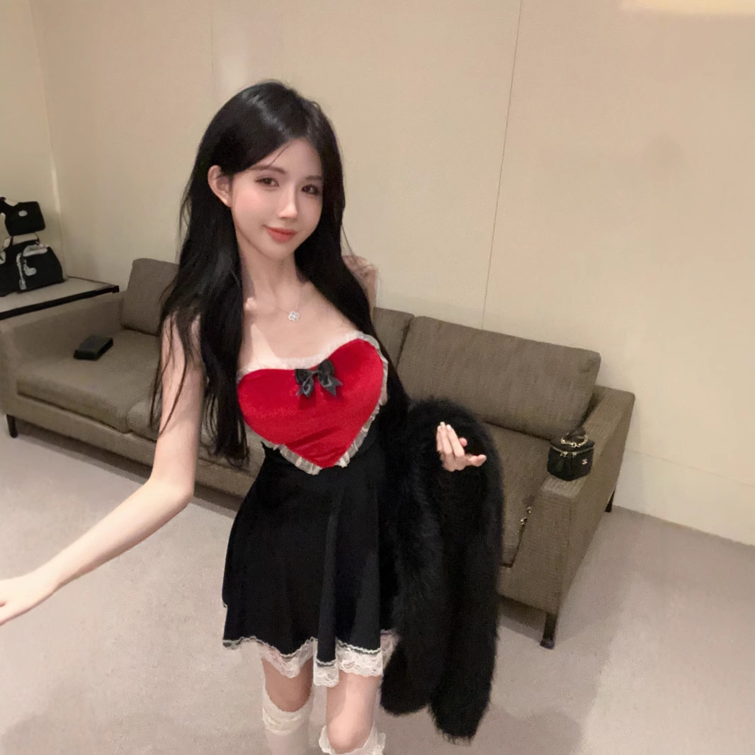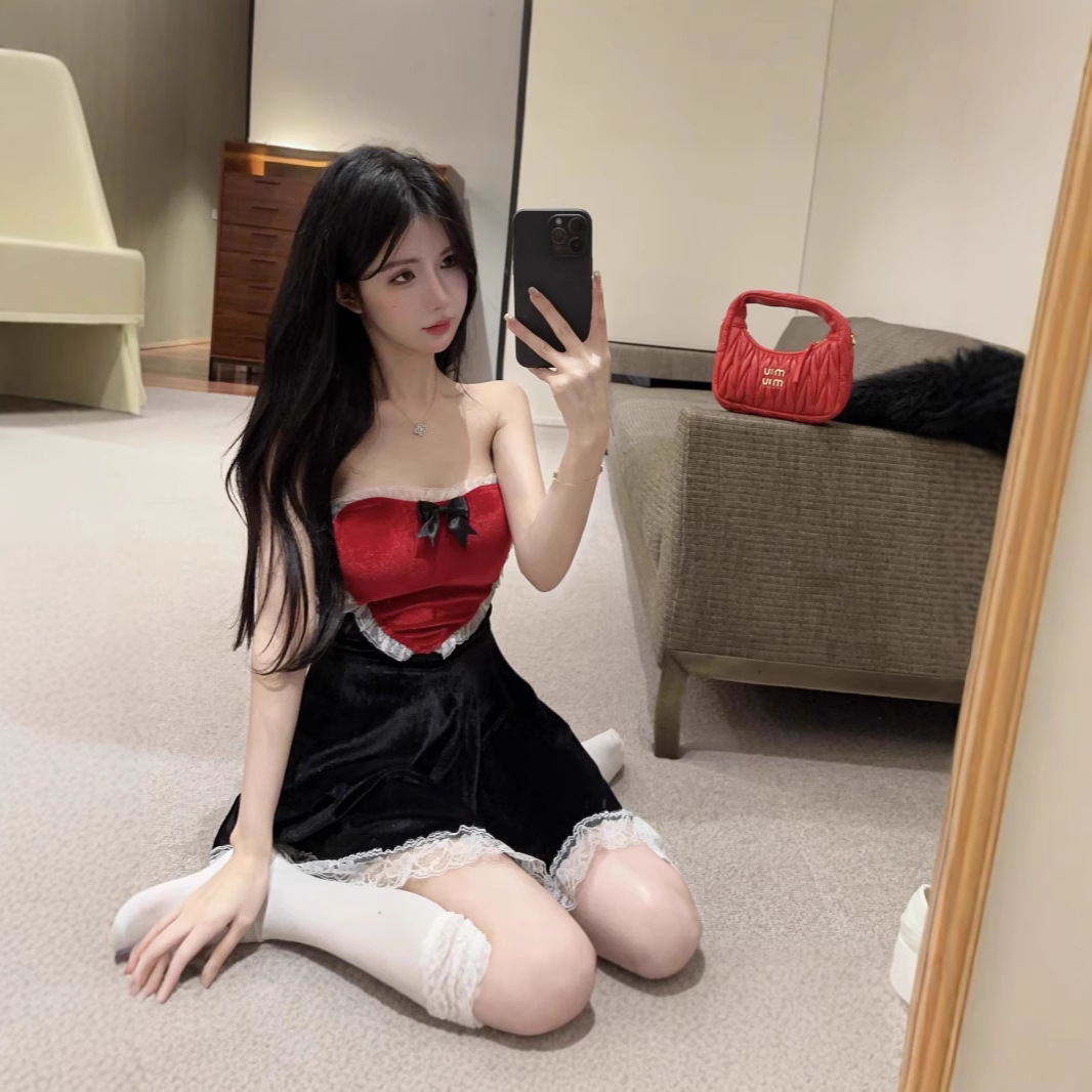 设计感蕾丝边性感辣妹抹胸裹胸大摆时尚显瘦拼色露背撞色连衣裙女