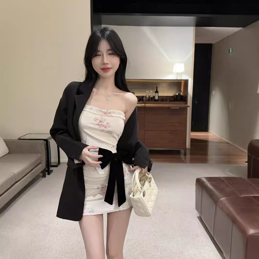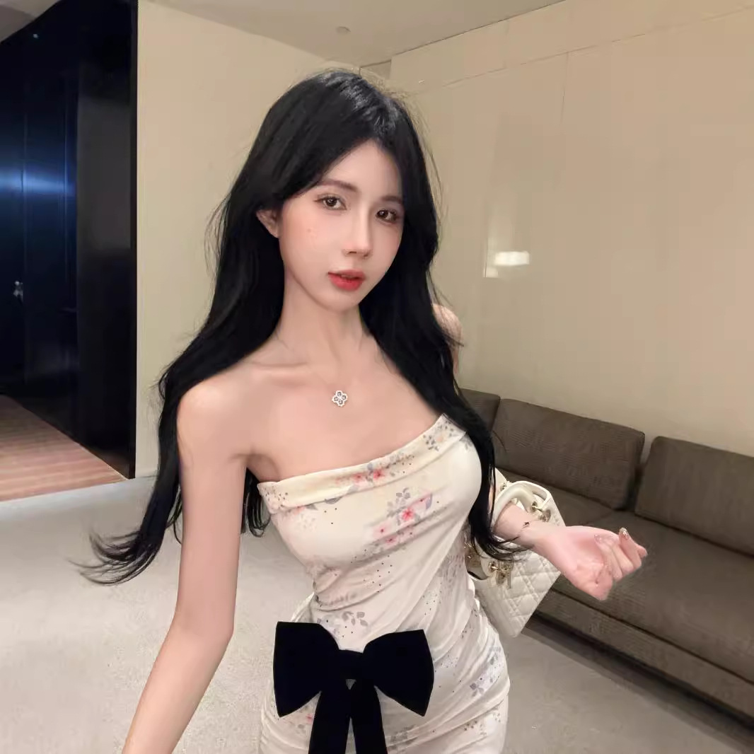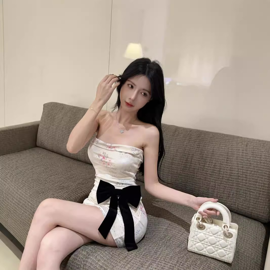 辣妹显瘦修身性感纯欲立体装饰蝴蝶结抹胸包臀复古裹胸礼服连衣裙
