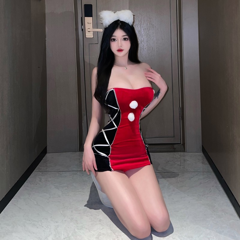 圣诞拼色无袖露肩内搭裹胸性感风夜店抹胸超短裙紧身包臀连衣裙女