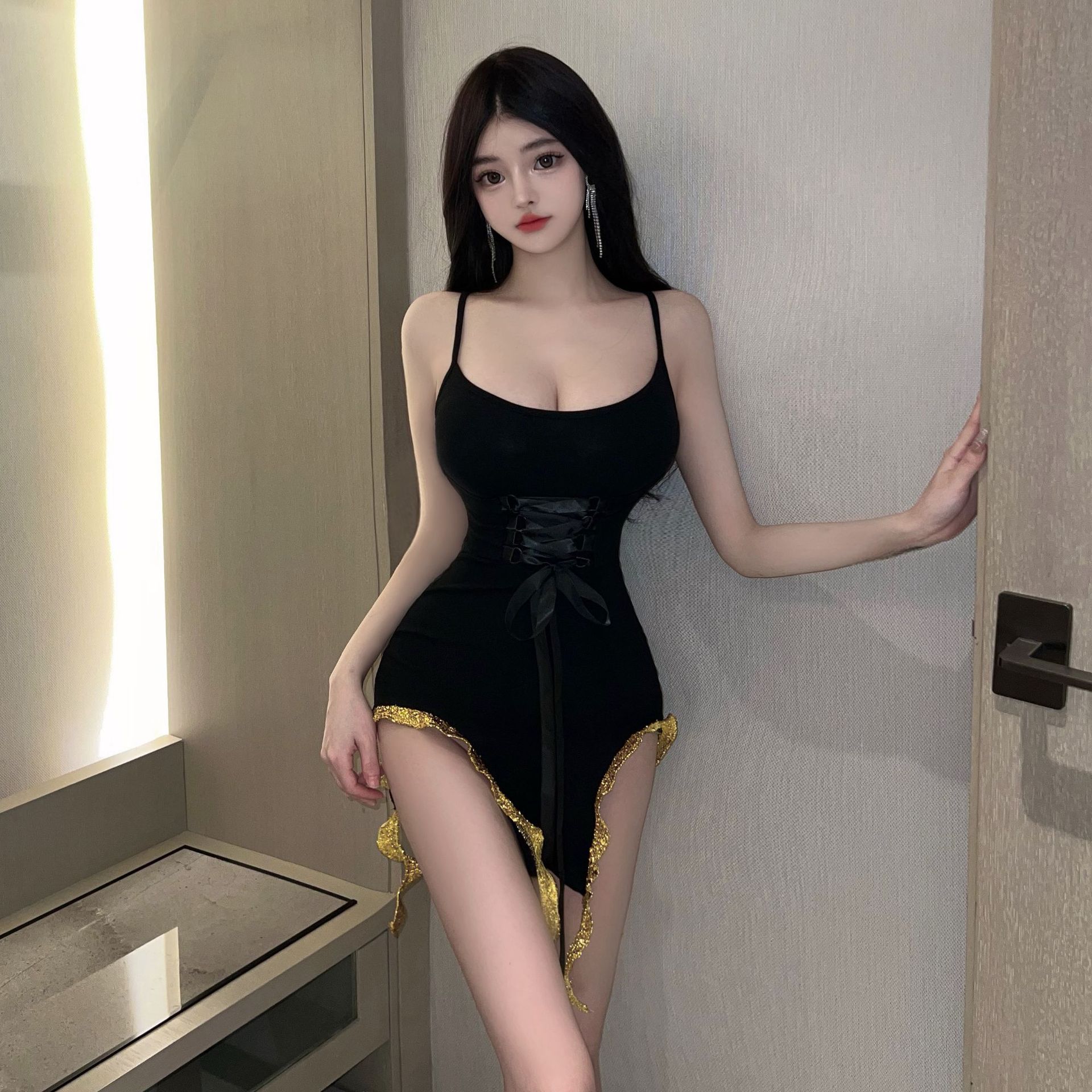 性感诱惑吊带超短不规则荷叶边辣妹木耳边系带飘带低胸露背连衣裙