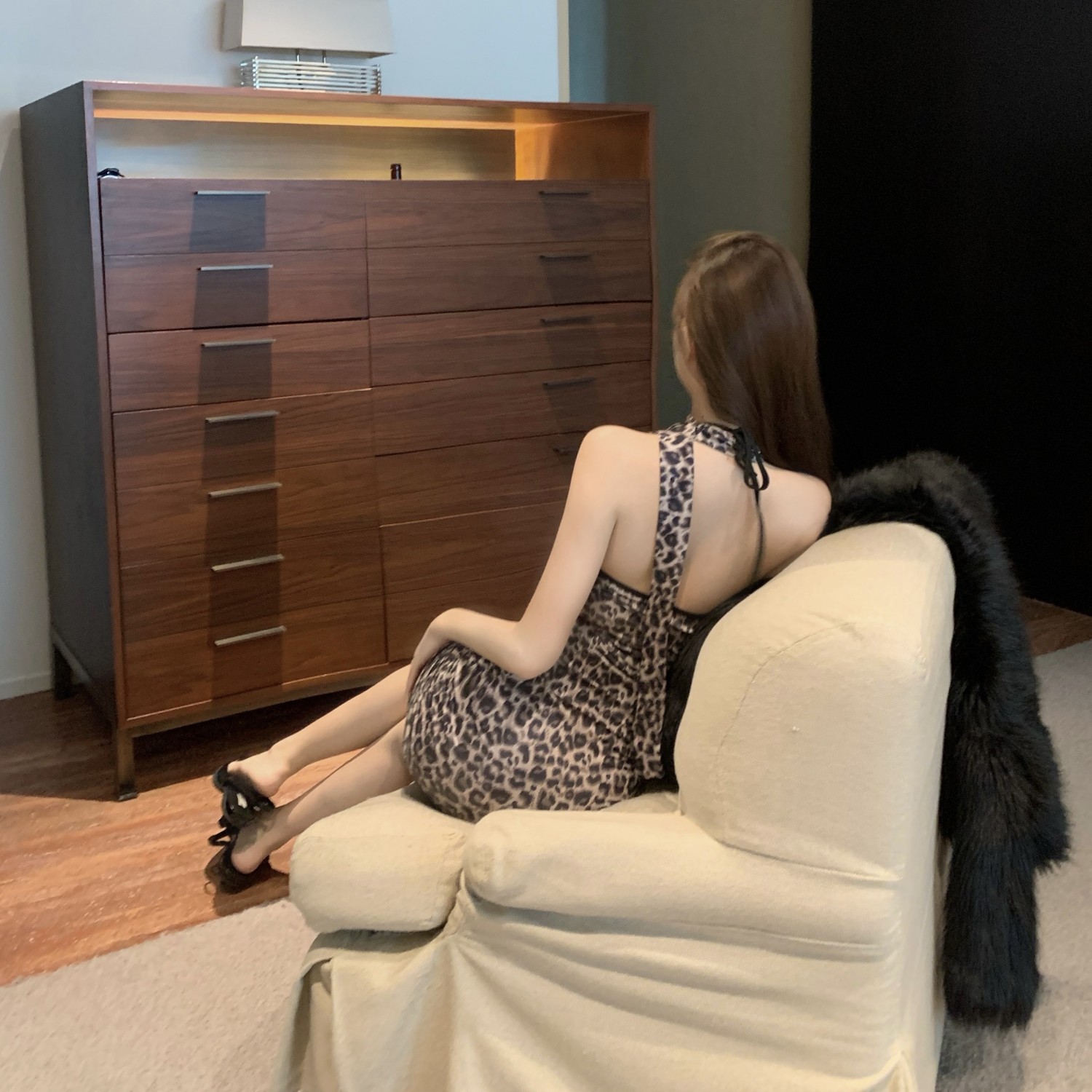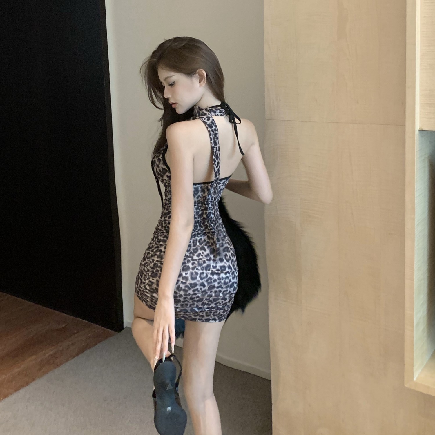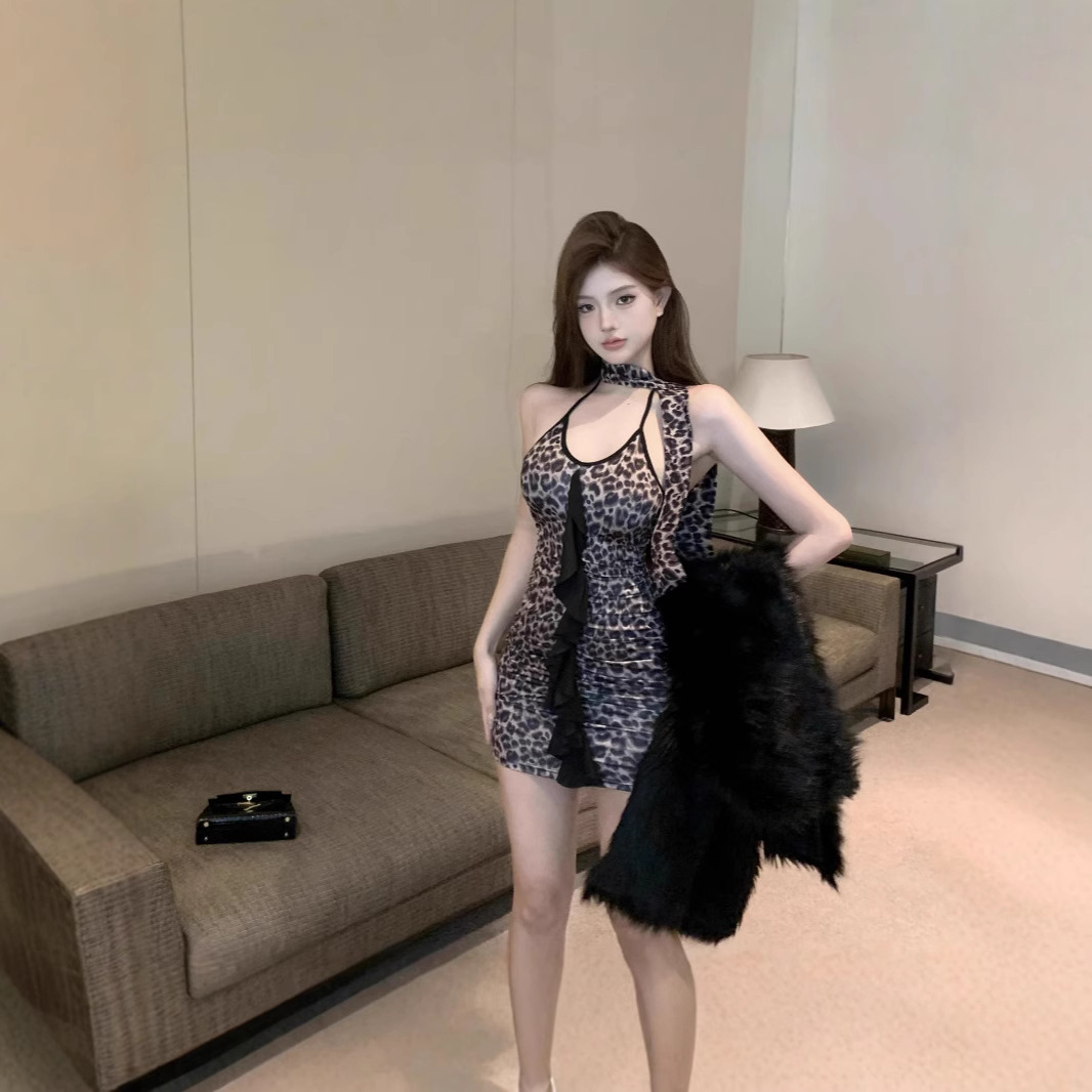 挂脖设计感飘带辣妹性感吊带紧身包臀豹纹吊带褶皱露背V领连衣裙