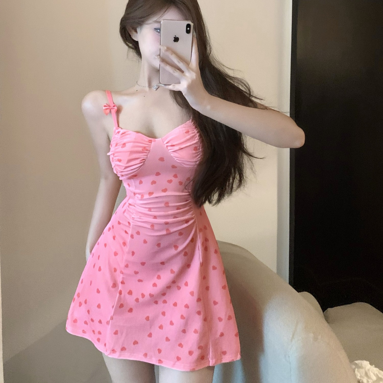 甜美低胸性感纯欲辣妹吊带蝴蝶结设计感丝绒粉色甜辣褶皱连衣裙女