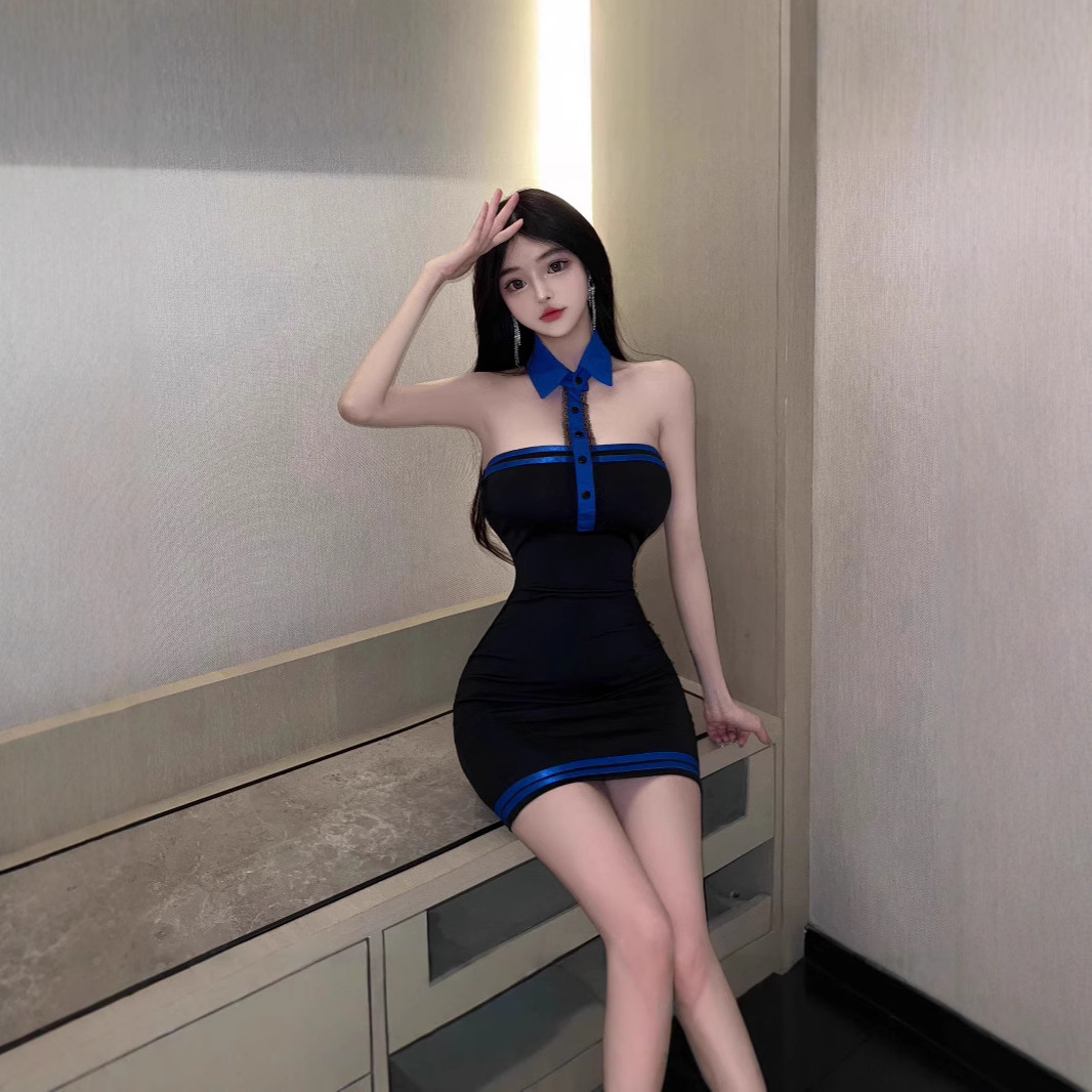 设计感挂脖拼接撞色纯欲辣妹性感夜店抹胸露背紧身包臀显瘦连衣裙
