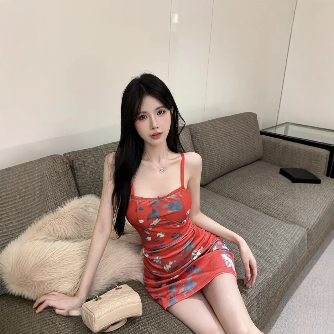 纯欲气质设计感红色印花吊带低胸丝绒紧身包臀四季款性感连衣裙女