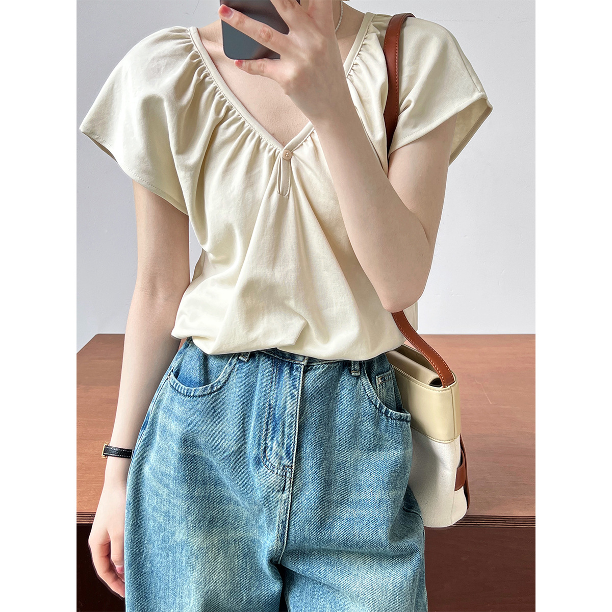 韩系设计感褶皱V领飞飞袖T恤女夏季气质简约露锁骨上衣