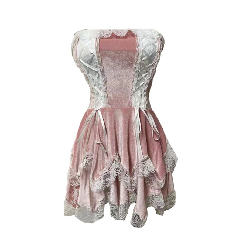 法式公主甜辣性感纯欲蕾丝拼接多层大摆袖套抹胸短裙收腰连衣裙女
