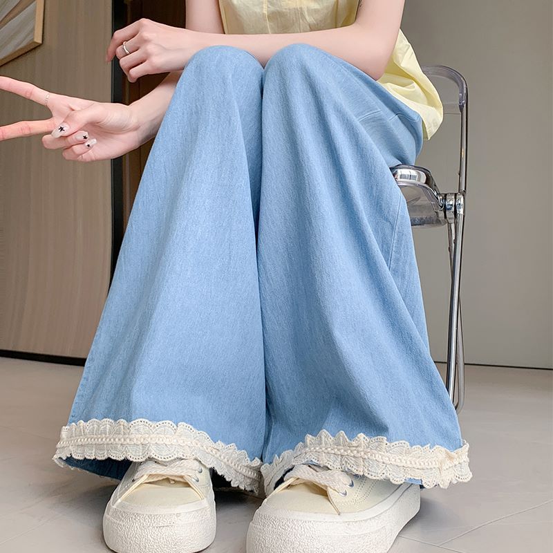 蕾丝花边拼接天丝牛仔裤女夏天薄款小个子高腰垂感宽松冰丝阔腿裤