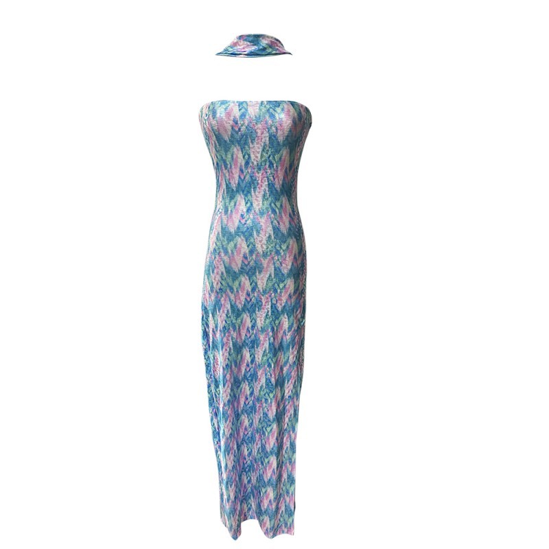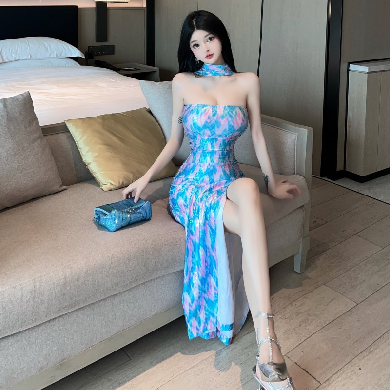 性感夜场个性印花挂脖低胸露肩抹胸开叉礼服长裙修身包臀连衣裙女